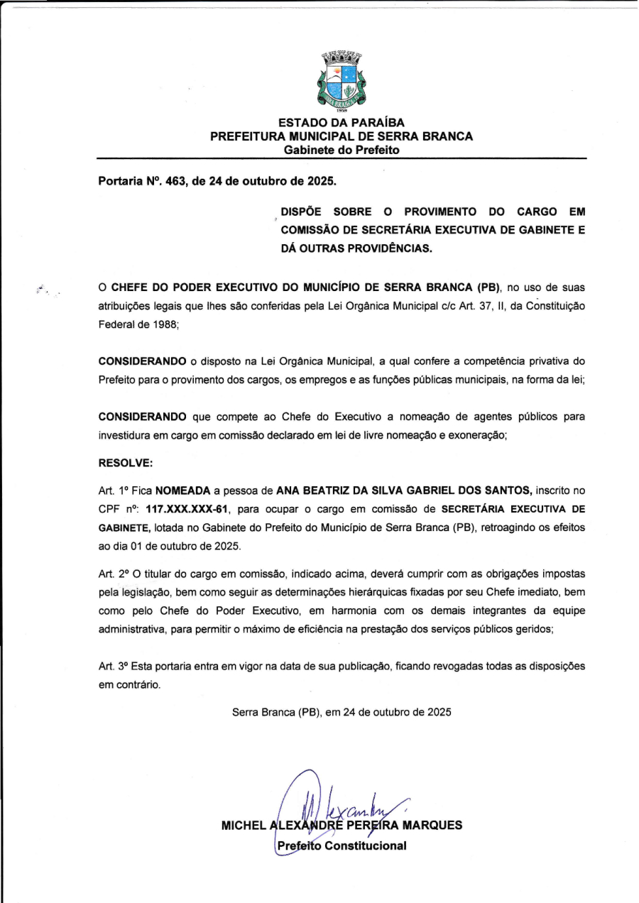 PORTARIA N° 0463/2025 - NOMEAÇÃO DE ANA BEATRIZ DA SILVA GABRIEL DOS SANTOS