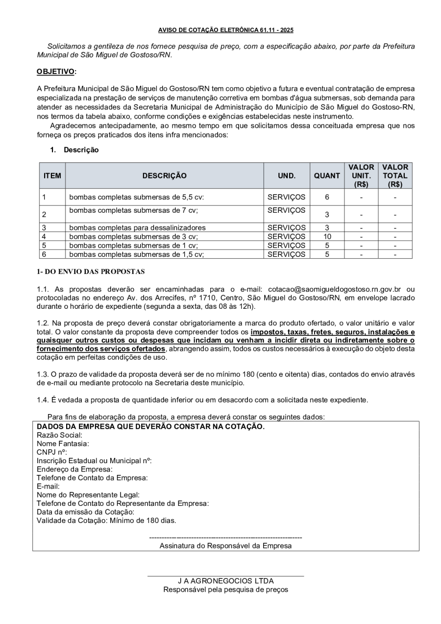 AVISO DE COTAÇÃO ELETRÔNICA 61.11 - 2025