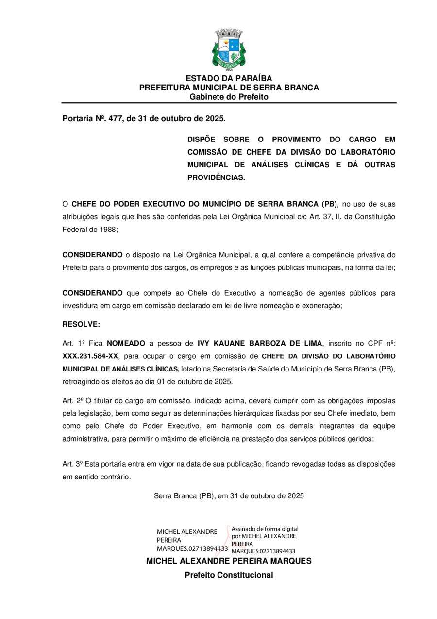 PORTARIA N° 0477/2025 - NOMEAÇÃO DE IVY KAUANE BARBOZA DE LIMA