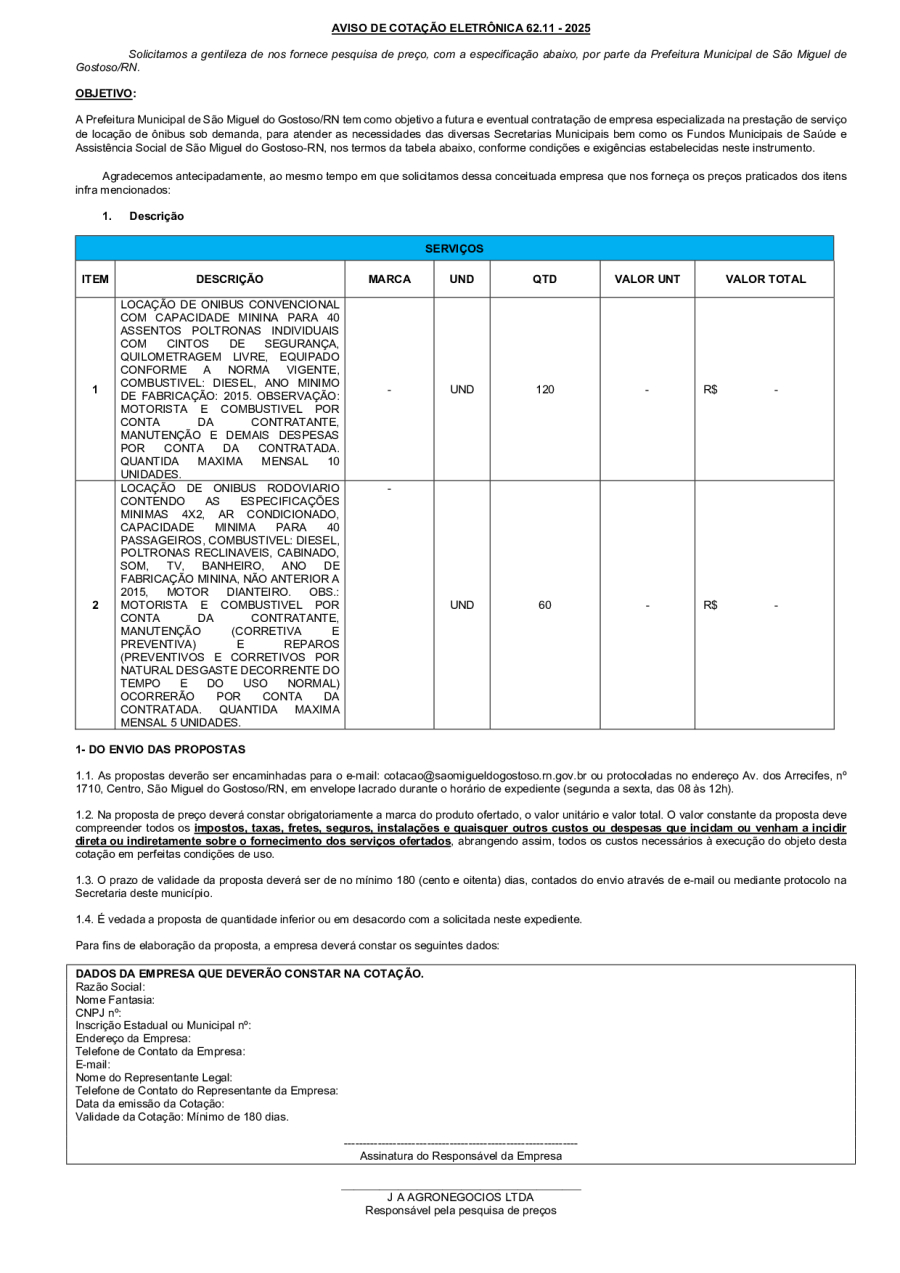 AVISO DE COTAÇÃO ELETRÔNICA 62.11 - 2025