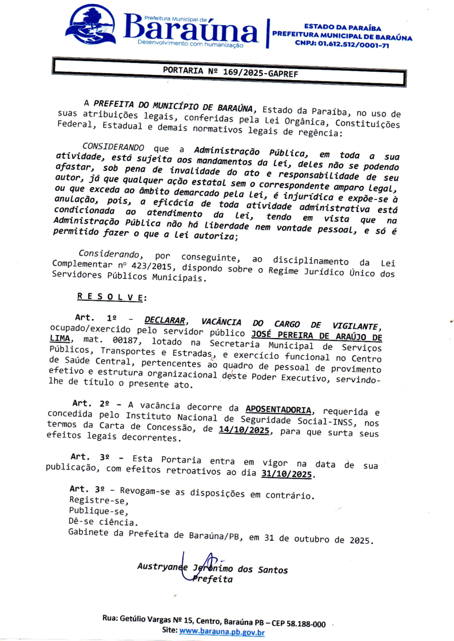 PORTARIA Nº 169/2025-GAPREF - DECLARAR VACÂNCIA DO CARGO DE VIGILANTE OCUPADO/EXERCIDO PELO SERVIDOR JOSÉ PEREIRA DE ARAÚJO DE LIMA. - 07 DE NOVEMBRO DE 2025.