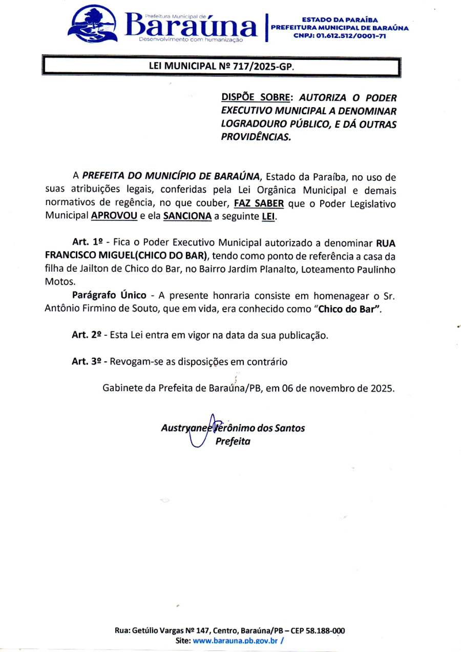 LEI MUNICIPAL Nº 717/2025-GP - DISPÕE SOBRE: AUTORIZA O PODER EXECUTIVO MUNICIPAL A DENOMINAR LOGRADOURO PÚBLICO, E DÁ OUTRAS PROVIDÊNCIAS. - 07 DE NOVEMBRO DE 2025.