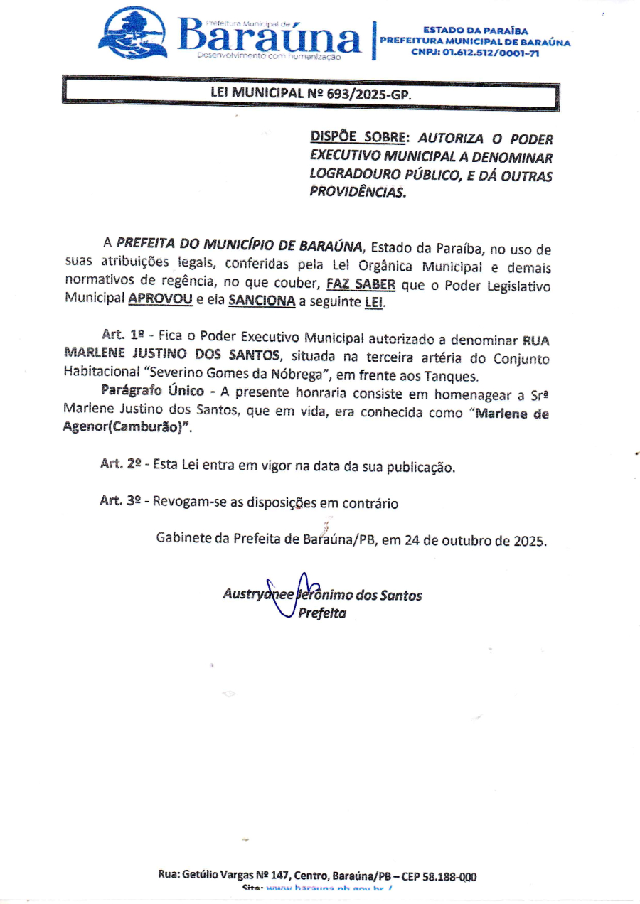 LEI MUNICIPAL Nº 693/2025-GP - DISPÕE SOBRE: AUTORIZA O PODER EXECUTIVO MUNICIPAL A DENOMINAR LOGRADOURO PÚBLICO, E DA OUTRAS PROVIDENCIAS. - 11 DE NOVEMBRO DE 2025.