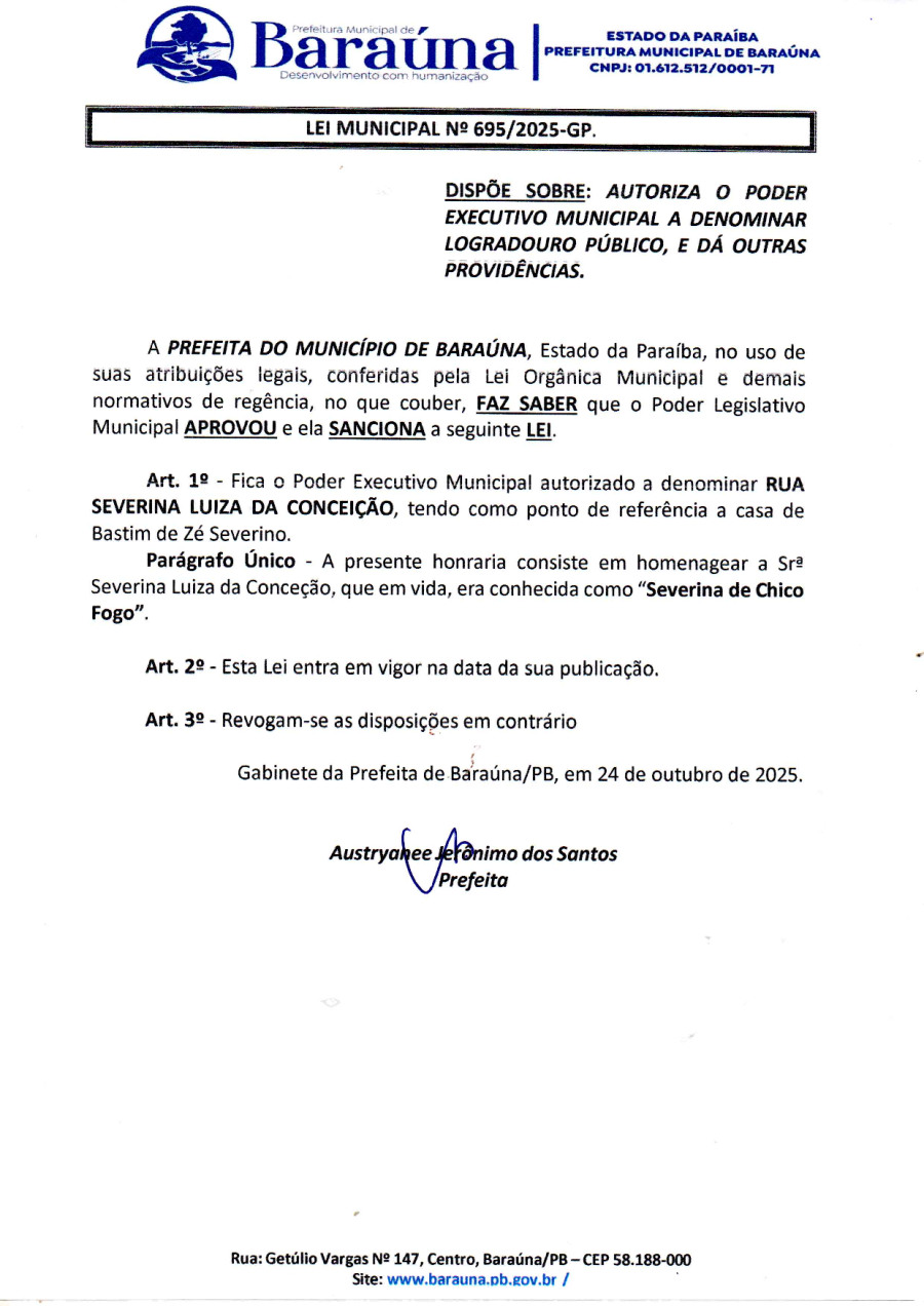 LEI MUNICIPAL Nº 695/2025-GP - DISPÕE SOBRE: AUTORIZA O PODER EXECUTIVO MUNICIPAL A DENOMINAR LOGRADOURO PÚBLICO E DA OUTRAS PROVIDENCIAS. - 11 DE NOVEMBRO DE 2025.