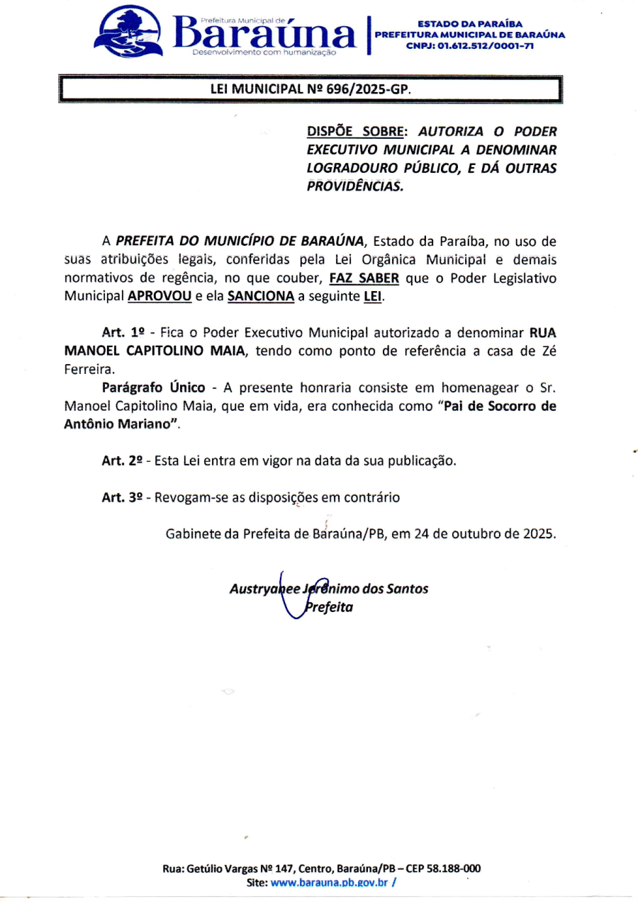 LEI MUNICIPAL Nº 696/2025-GP - DISPÕE SOBRE: AUTORIZA O PODER EXECUTIVO MUNICIPAL A DENOMINAR LOGRADOURO PÚBLICO E DÁ OUTRAS PROVIDENCIAS. - 11 DE NOVEMBRO DE 2025.