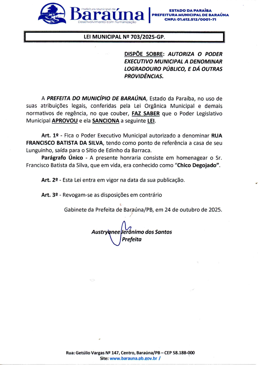 LEI MUNICIPAL Nº 703/2025-GP - DISPÕE SOBRE: AUTORIZA O PODER EXECUITIVO MUNICIPAL A DENOMINAR LOGRADOURO PUBLICO E DA OUTRAS PROVIDENCIAS. - 12 DE NOVEMBRO DE 2025.
