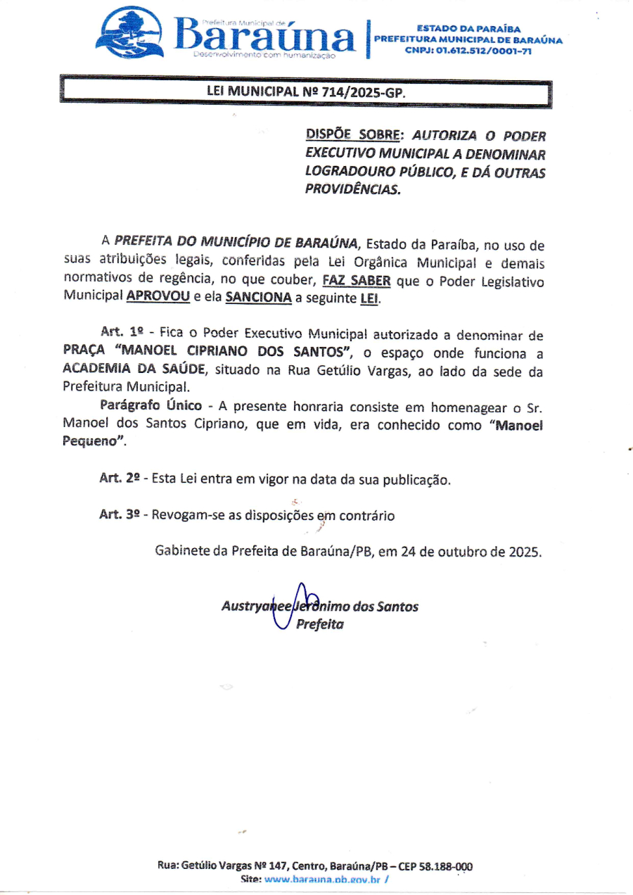 LEI MUNICIPAL Nº 714/2025-GP - DISPÕE SOBRE: AUTORIZA O PODER EXECUTIVO MUNICIPAL A DENOMINAR LOGRADOURO PUBLICO E DA OUTRAS PROVIDENCIAS. - 12 DE NOVEMBRO DE 2025.