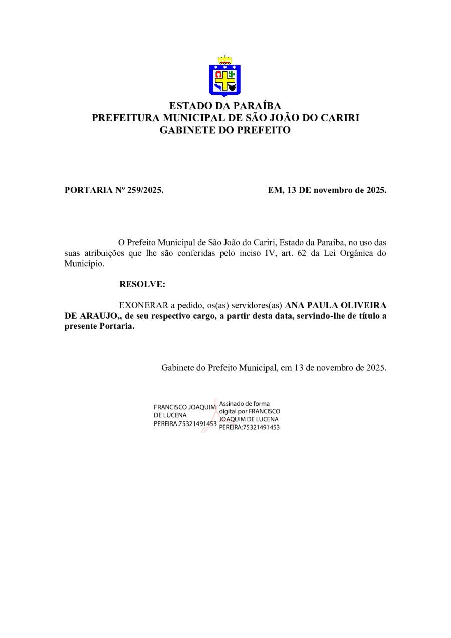 Conforme MP n° 2.200-2 de 24/08/2001, que institui a infraestrutura de chaves Públicas. Matéria Publicada no Diário Oficial do Município de São João do Cariri/PB no dia - Edição 01859.