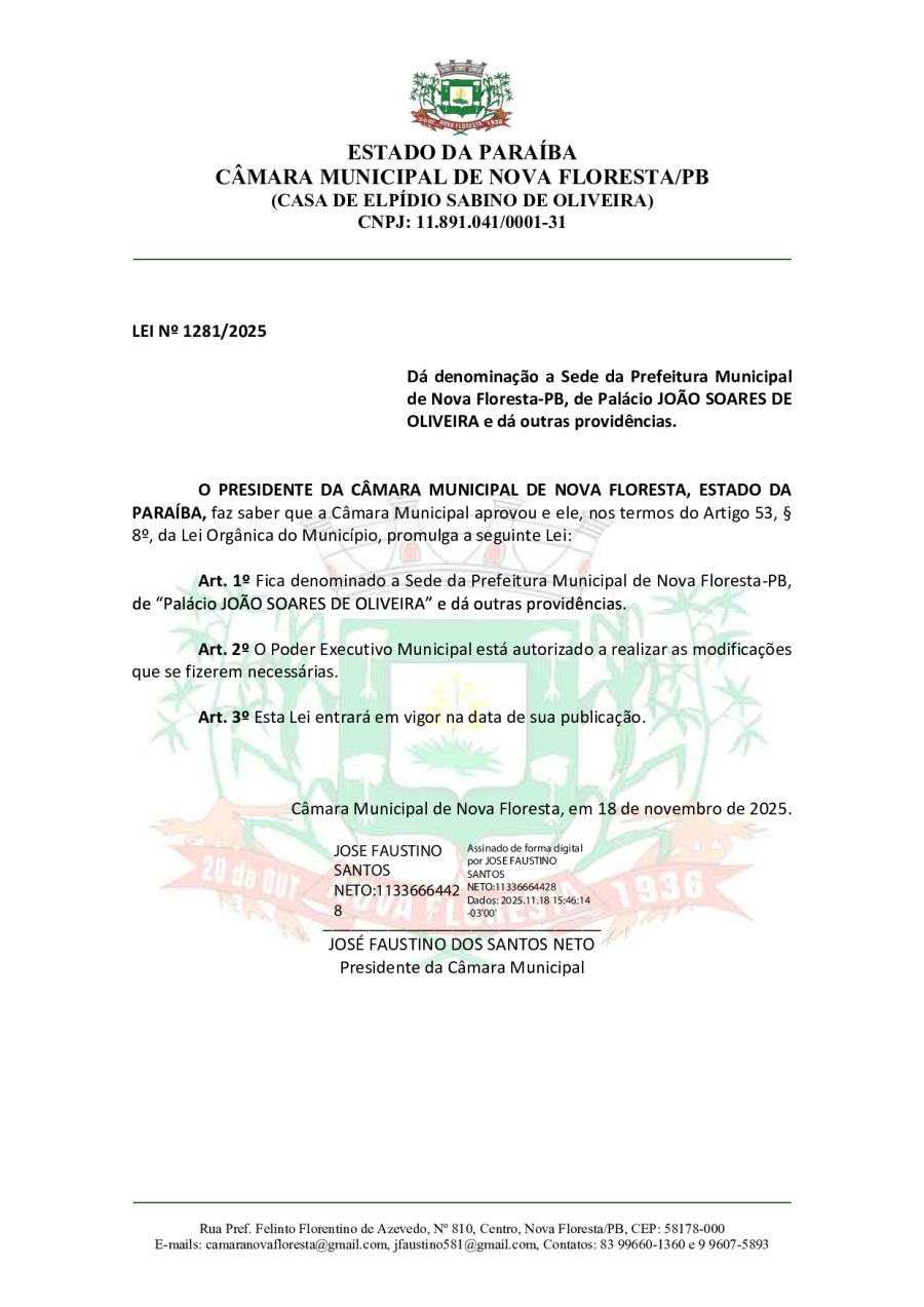 LEI Nº 1281/2025 - DÁ DENOMINAÇÃO A SEDE DA PREFEITURA MUNICIPAL DE NOVA FLORESTA-PB, DE PALÁCIO JOÃO SOARES DE OLIVEIRA