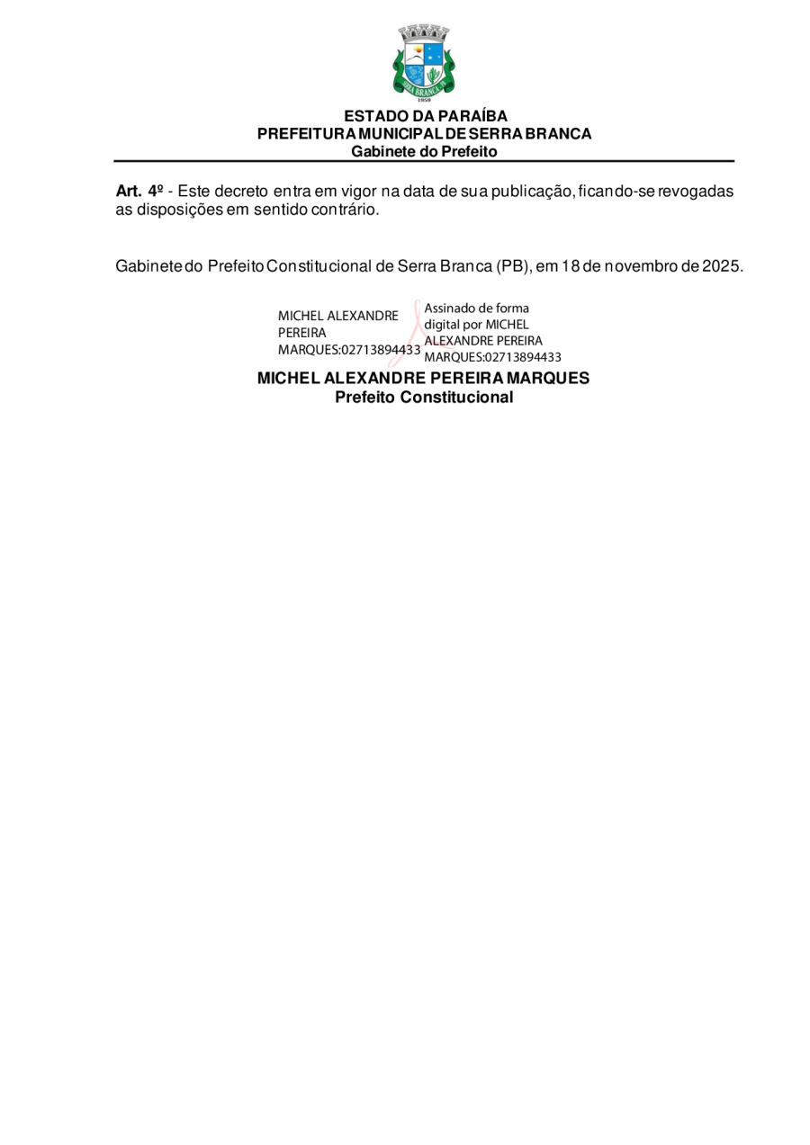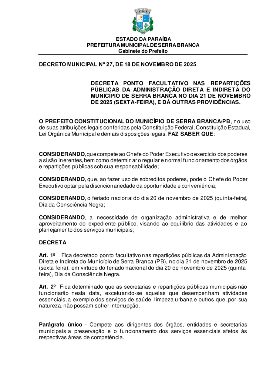 DECRETO N° 0027/2025 - DECRETA PONTO FACULTATIVO NAS REPARTIÇÕES PÚBLICAS DA ADMINISTRAÇÃO DIRETA E INDIRETA DO MUNICÍPIO DE SERRA BRANCA NO DIA 21 DE NOVEMBRO DE 2025