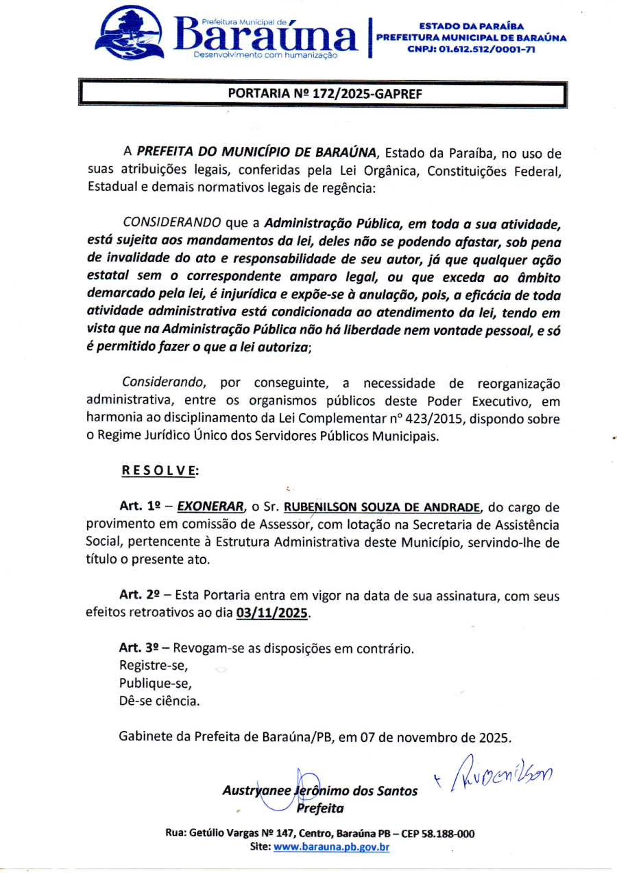 PORTARIA Nº 172/2025-GAPREF- EXONERAR O SR. RUBENILSON SOUZA DE ANDRADE, DO CARGO DE PROVIMENTO EM COMISSÃO DE ASSESSOR. - 18 DE NOVEMBRO DE 2025.