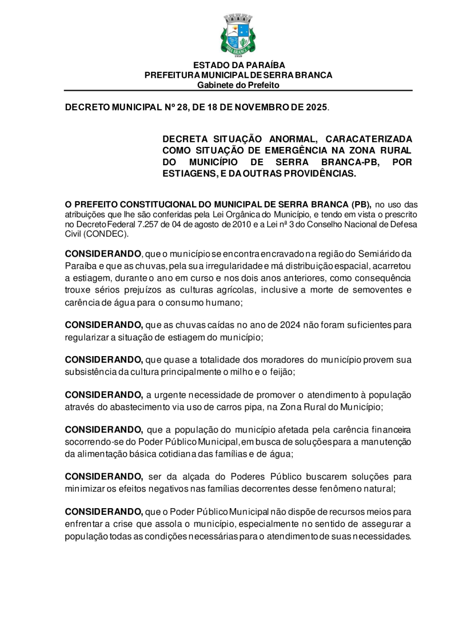 DECRETO N° 0028/2025 - DECRETA SITUAÇÃO ANORMAL, CARACATERIZADA COMO SITUAÇÃO DE EMERGÊNCIA NA ZONA RURAL DO MUNICÍPIO