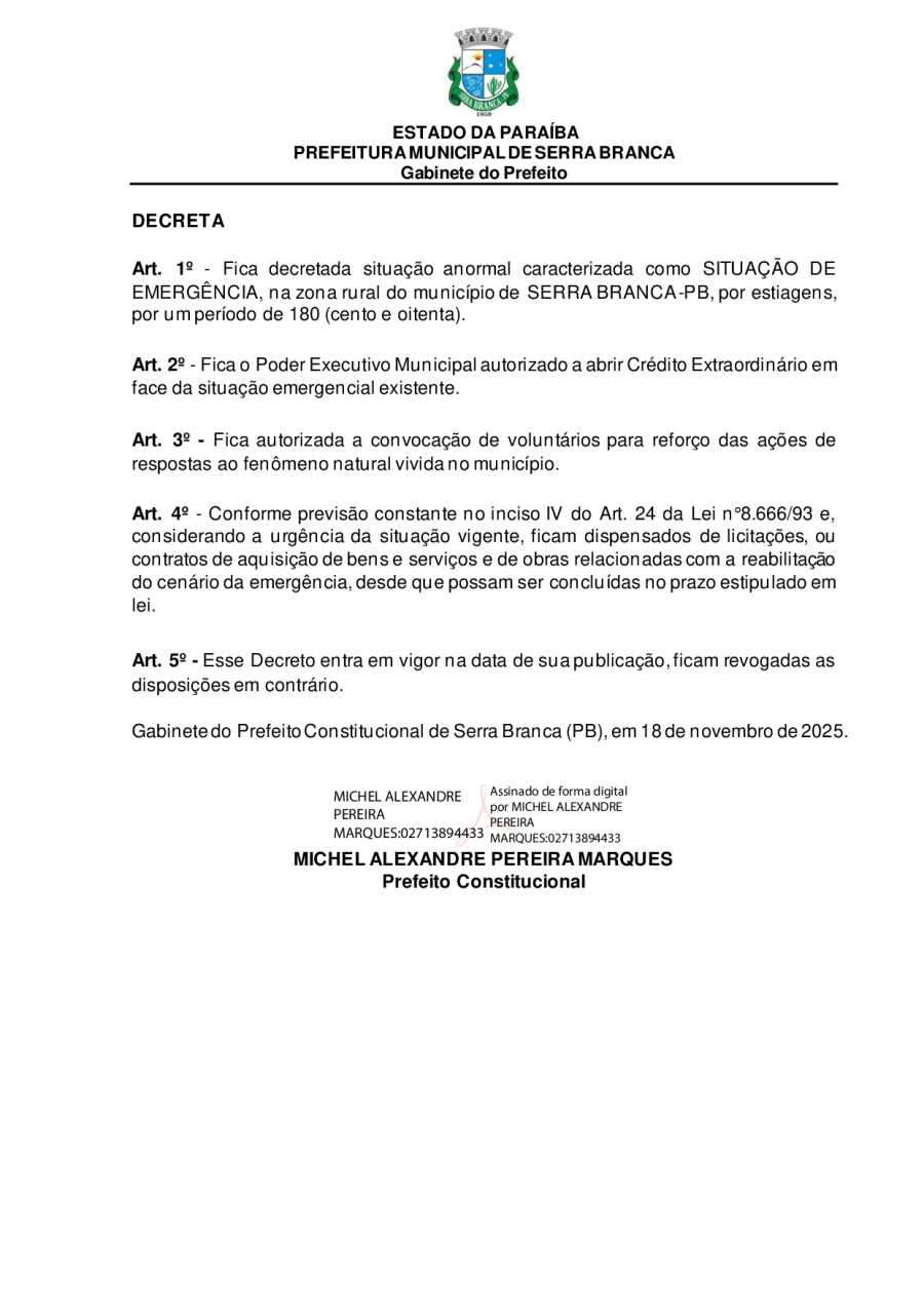 Conforme MP n° 2.200-2 de 24/08/2001, que institui a infraestrutura de chaves Públicas. Matéria Publicada no Diário Oficial do Município de Serra Branca/PB no dia - Edição 00221.