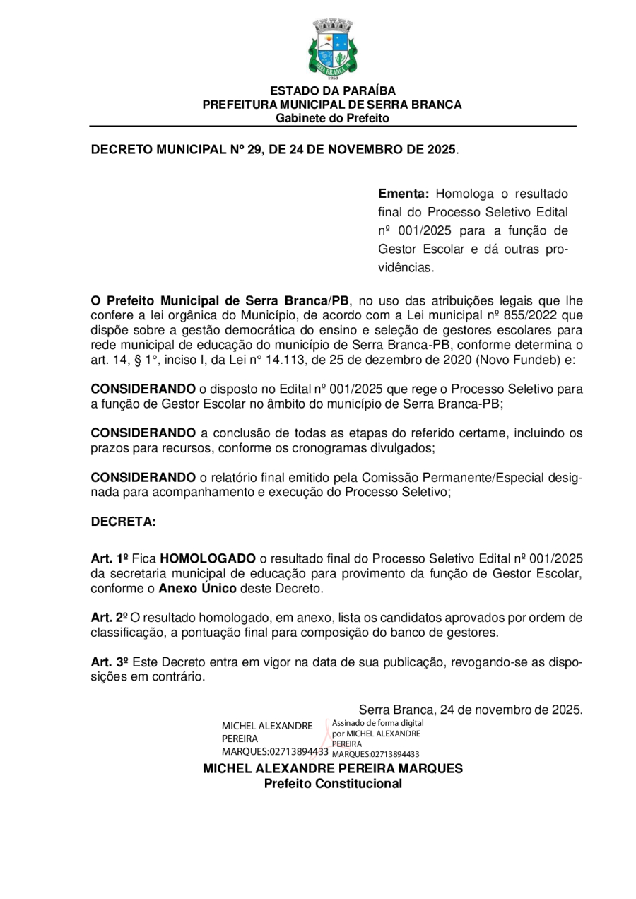 DECRETO N° 0029/2025 - HOMOLOGA O RESULTADO FINAL DO PROCESSO SELETIVO EDITAL Nº 001/2025 PARA A FUNÇÃO DE GESTOR ESCOLAR