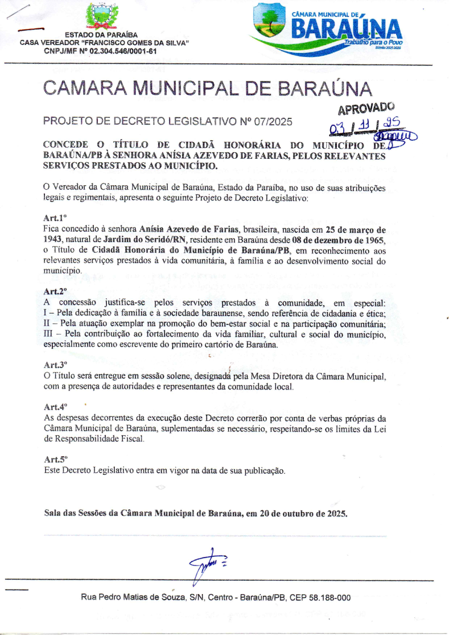RETIFICAÇÃO - PROJETO DE DECRETO LEGISLATIVO Nº 07/2025 - CONCEDE O TITULO DE CIDADÃ HONORÁRIA DO MUNICIPIO DE BARAÚNA/PB A SENHORA ANISIA AZEVEDO DE FARIAS. - 24 DE NOVEMBRO DE 2025.