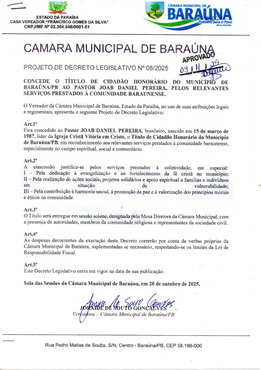 RETIFICAÇÃO - PROJETO DE DECRETO LEGISLATIVO Nº 08/2025 - CONCEDE O TITULO DE CIDADÃO HONORARIO DO MUNICIPIO DE BARAÚNA/PB AO PASTOR JOAB DANIEL PEREIRA. - 24 DE NOVEMBRO DE 2025.
