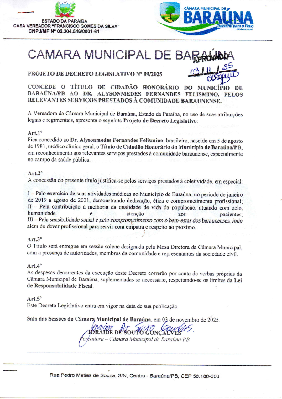 PROJETO DE DECRETO LEGISLATIVO Nº 09/2025 - CONCEDE O TITULO DE CIDADÃO HONORARIO DO MUNICIPIO DE BARAÚNA/PB AO DR. ALYSONMEDES FERNANDES FELISMINO. - 24 DE NOVEMBRO DE 2025.