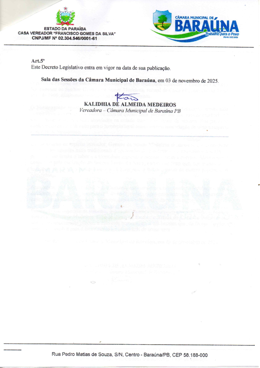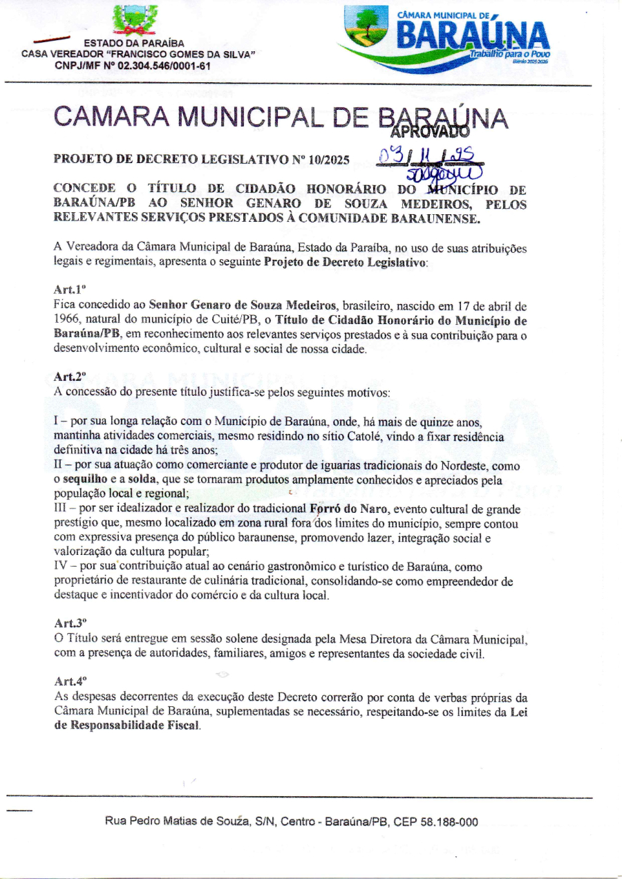 PROJETO DE DECRETO LEGISLATIVO Nº 10/2025 - CONCEDE O TITULO DE CIDADÃO HONORARIO DO MUNICIPIO DE BARAÚNA/PB AO SENHOR GENARO DE SOUZA MEDEIROS. - 24 DE NOVEMBRO DE 2025.