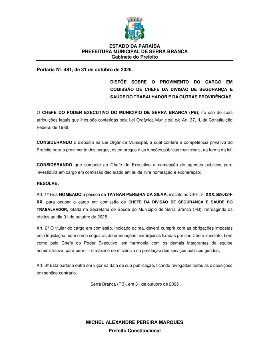 PORTARIA N° 0481/2025 - NOMEAÇÃO DE TAYNAR PEREIRA DA SILVA