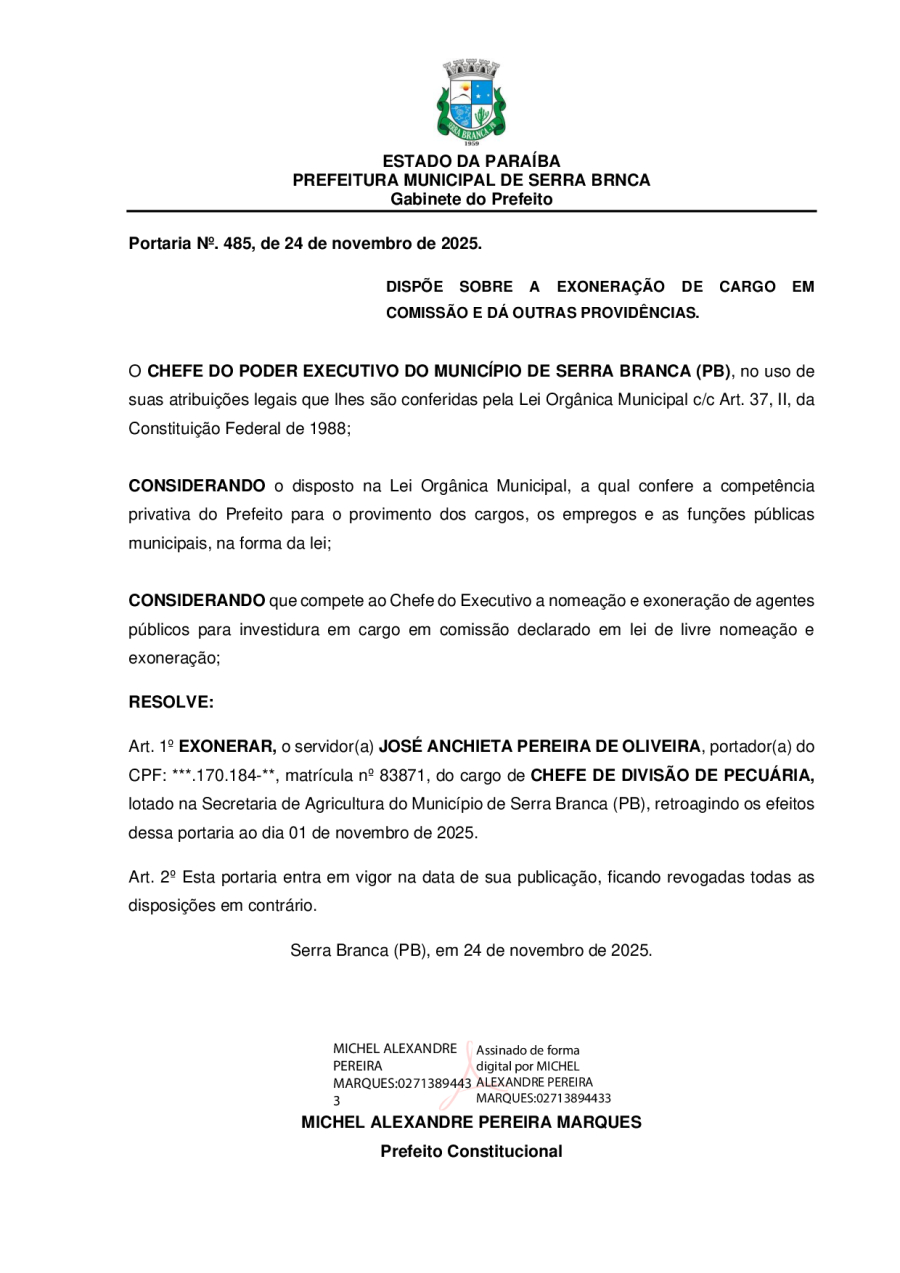 PORTARIA N° 0485/2025 - EXONERAÇÃO DE JOSÉ ANCHIETA PEREIRA DE OLIVEIRA