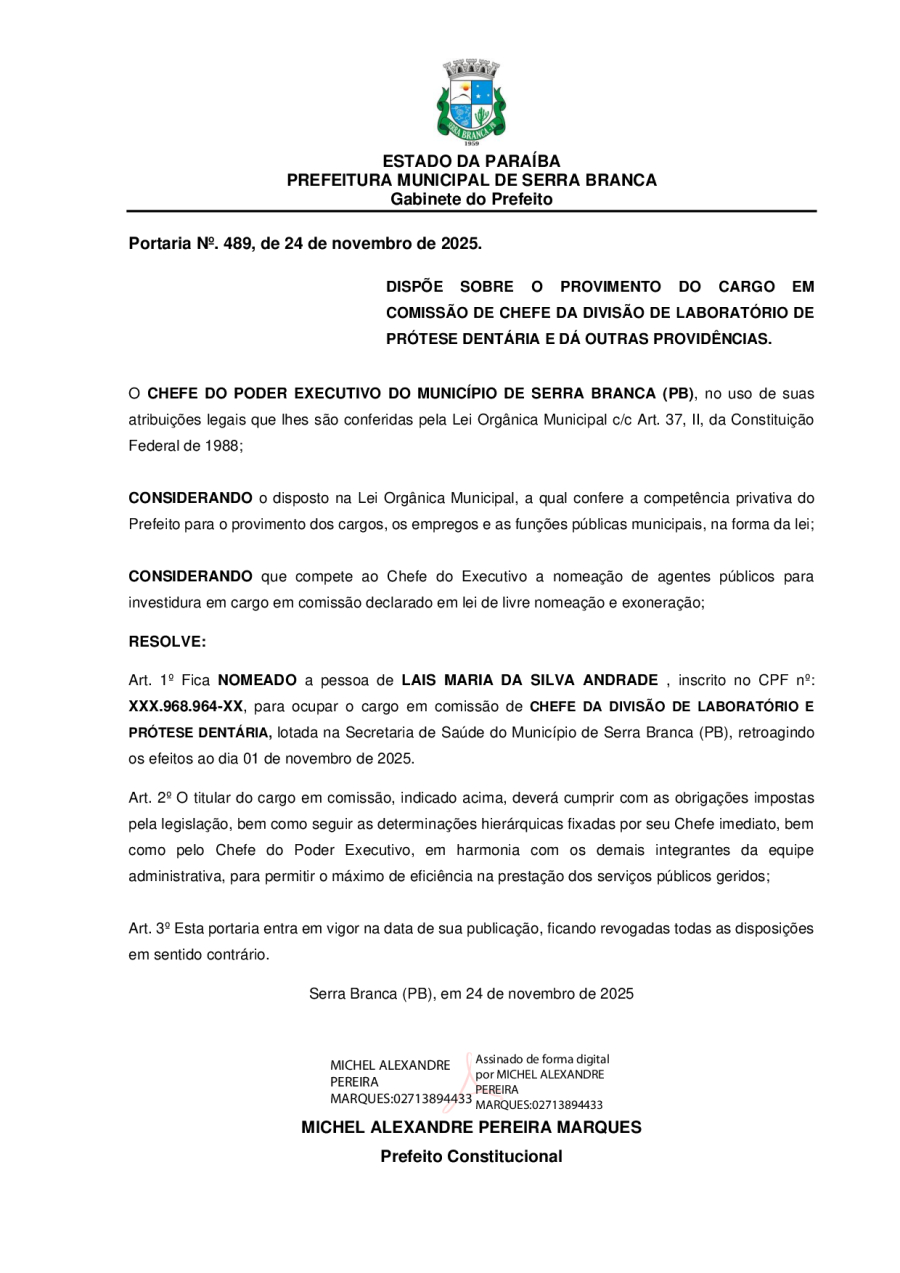 PORTARIA N° 0489/2025 - NOMEAÇÃO DE LAIS MARIA DA SILVA ANDRADE