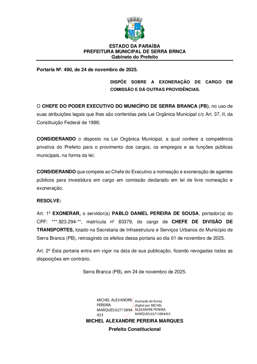 PORTARIA N° 0490/2025 - EXONERAÇÃO DE PABLO DANIEL PEREIRA DE SOUSA