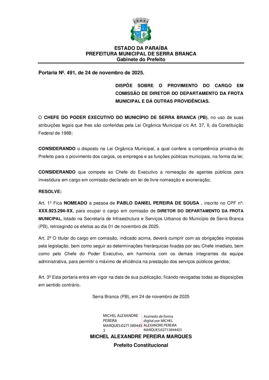 PORTARIA N° 0491/2025 - NOMEAÇÃO DE PABLO DANIEL PEREIRA DE SOUSA