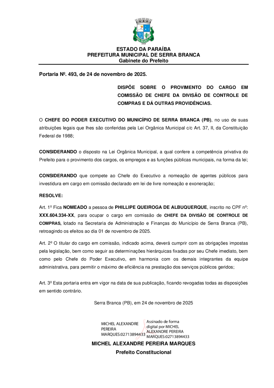PORTARIA N° 0493/2025 - NOMEAÇÃO DE PHILLIPE QUEIROGA DE ALBUQUERQUE