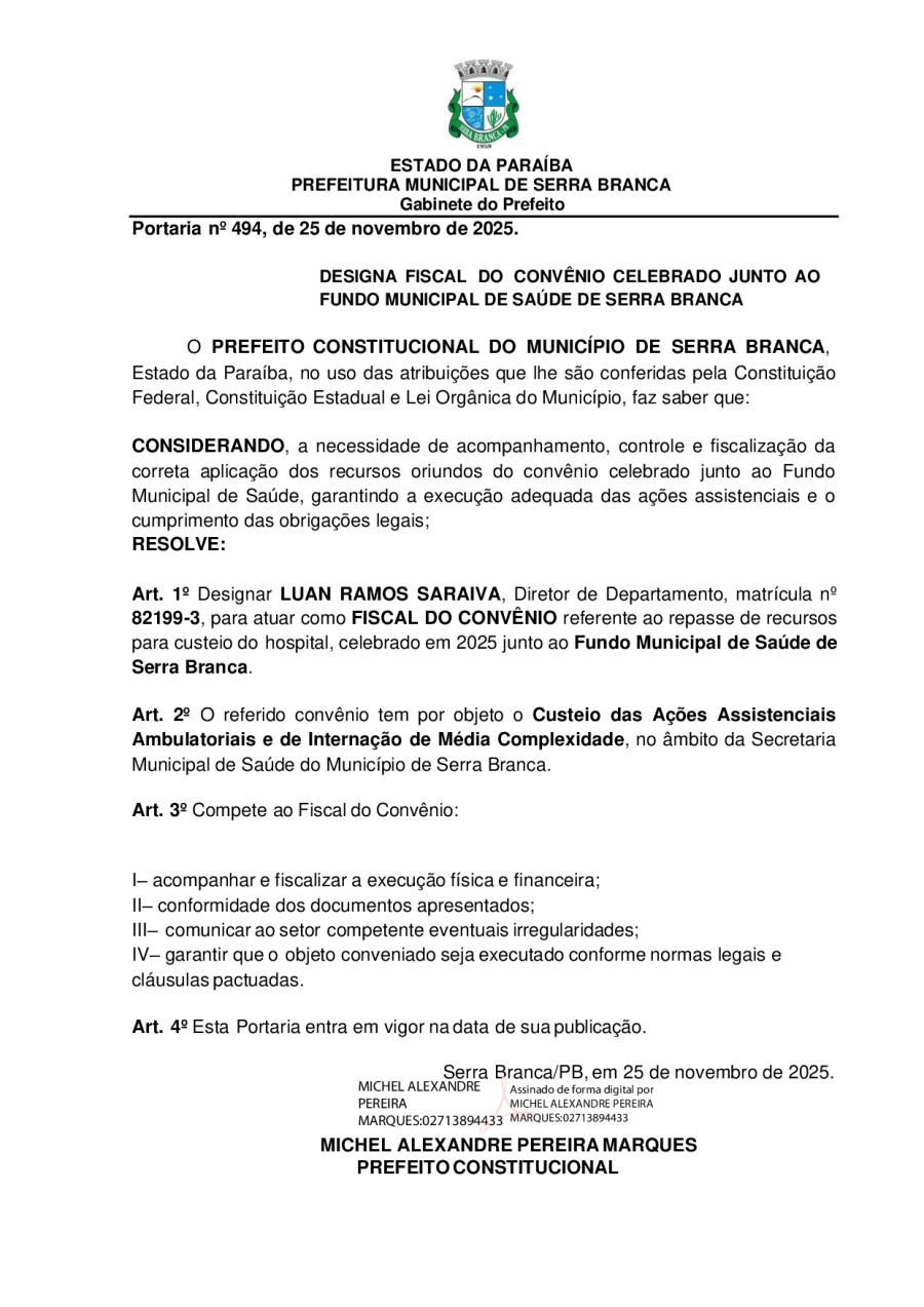 PORTARIA N° 0494/2025 - DESIGNA FISCAL DO CONVÊNIO CELEBRADO JUNTO AO FUNDO MUNICIPAL DE SAÚDE