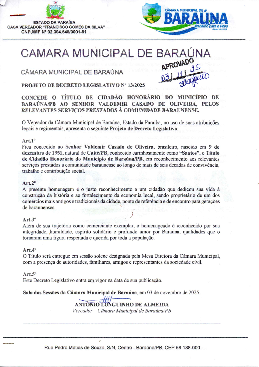 PROJETO DE DECRETO LEGISLATIVO Nº 13/2025 - CONCEDE O TITULO DE CIDADÃO HONORARIO DO MUNICIPIO DE BARAÚNA/PB AO SENHOR VALDEMIR CASADO DE OLIVEIRA.