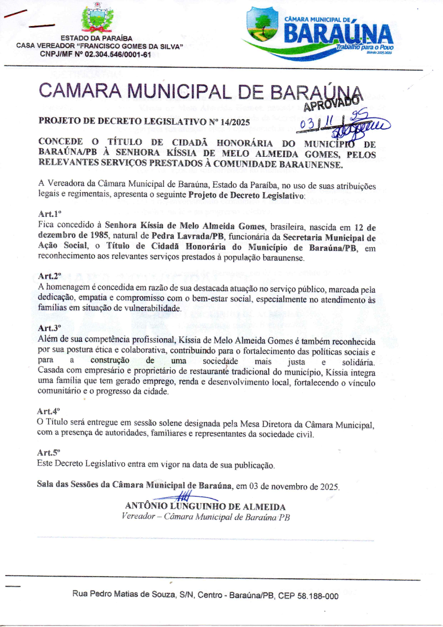 PROJETO DE DECRETO LEGISLATIVO Nº 14/2025 - CONCEDE TITULO DE CIDADÃ HONORARIA DO MUNICIPIO DE BARAÚNA/PB A SENHORA KISSIA DE MELO ALMEIDA. - 25 DE NOVEMBRO DE 2025.