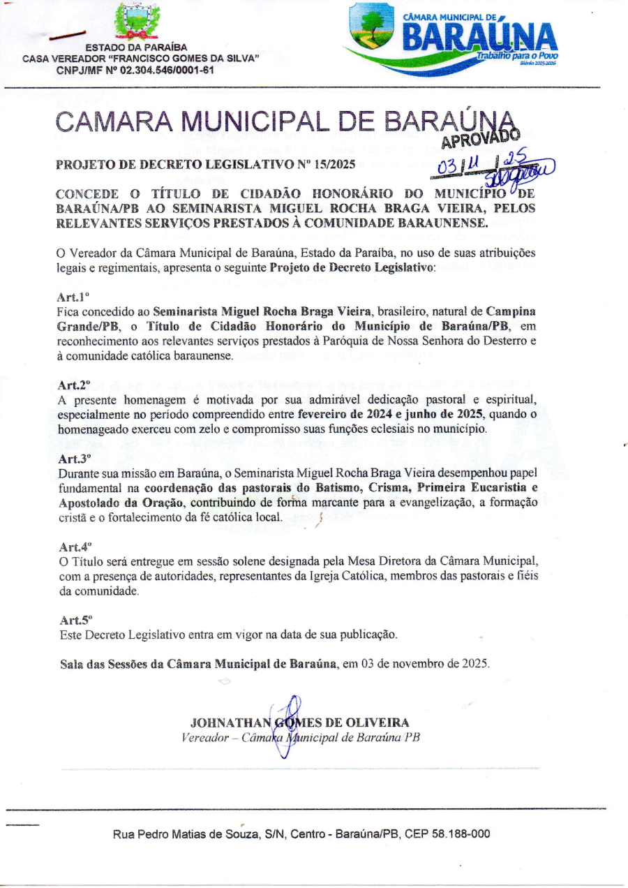 PROJETO DE DECRETO LEGISLATIVO Nº 15/2025 - CONCEDE O TITULO DE CIDADÃO HONORARIO DO MUNICIPIO DE BARAÚNA/PB AO SEMINARISTA MIGUEL ROCHA BRAGA VIEIRA. - 25 DE NOVEMBRO DE 2025