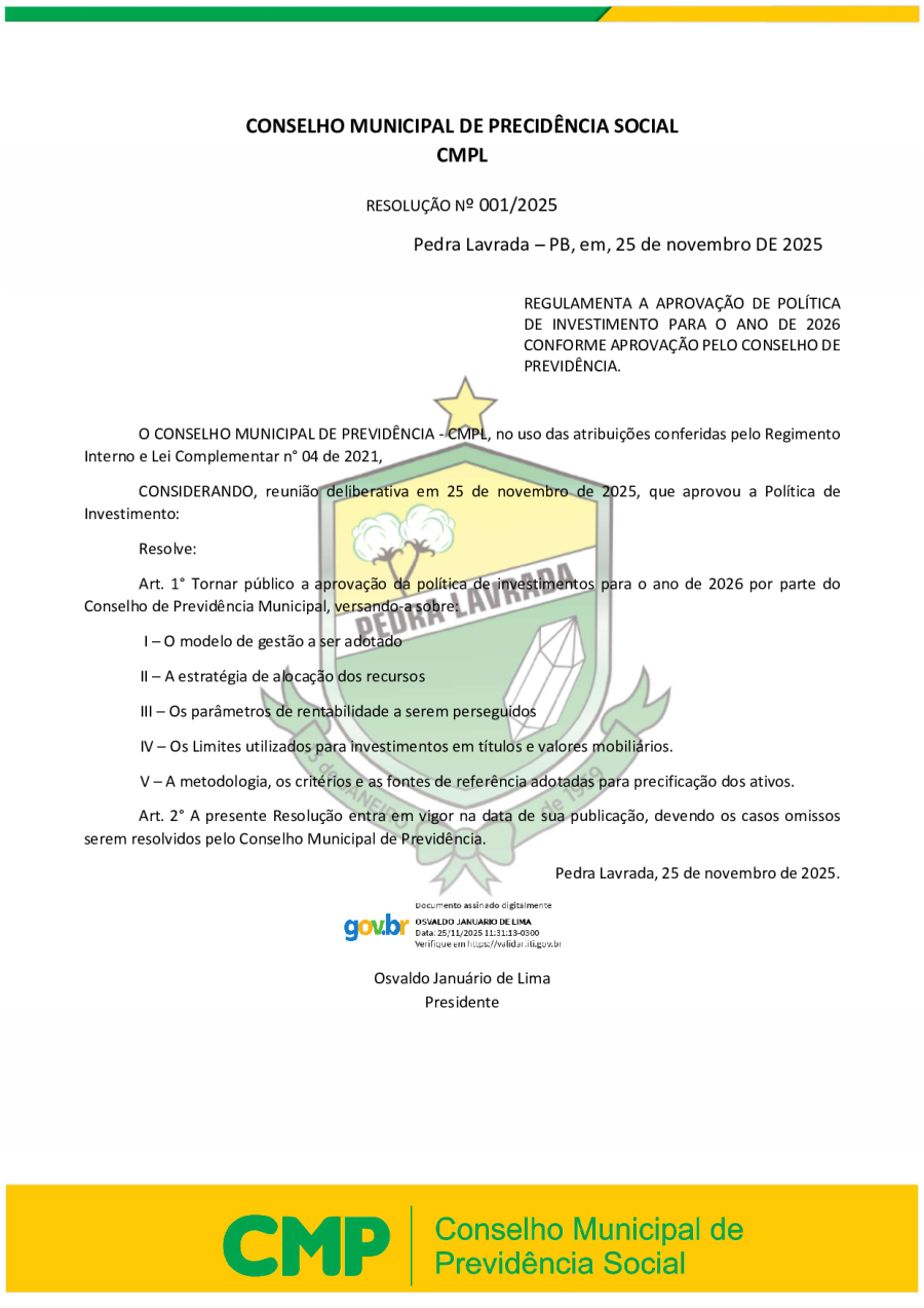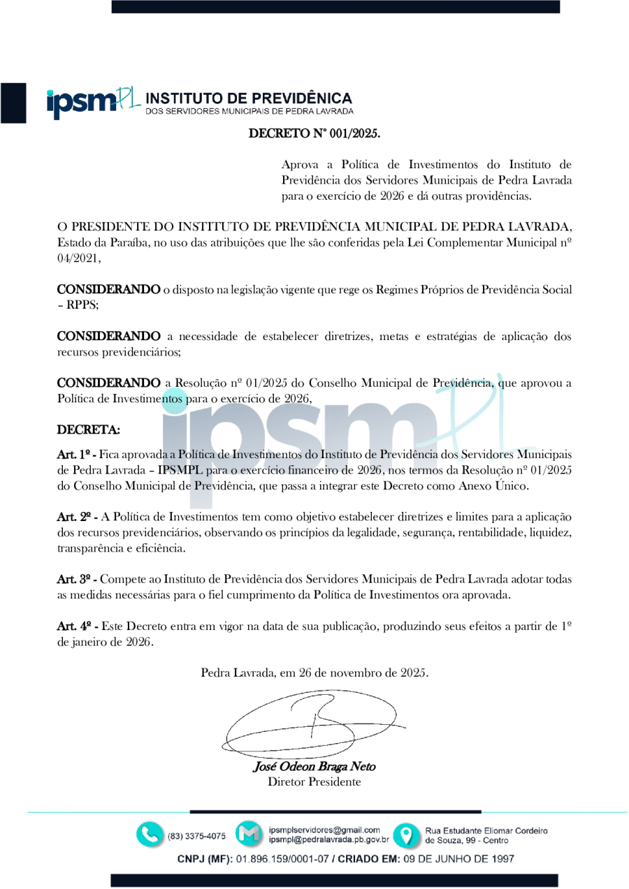 DECRETO N° 0001/2025 - APROVA A POLÍTICA DE INVESTIMENTOS DO INSTITUTO DE PREVIDÊNCIA DOS SERVIDORES MUNICIPAIS DE PEDRA LAVRADA PARA O EXERCÍCIO DE 2026