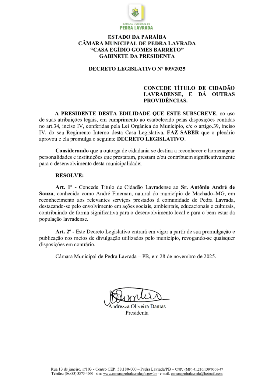 DECRETO LEGISLATIVO N° 009/2025 - CONCEDE TÍTULO DE CIDADÃO LAVRADENSE