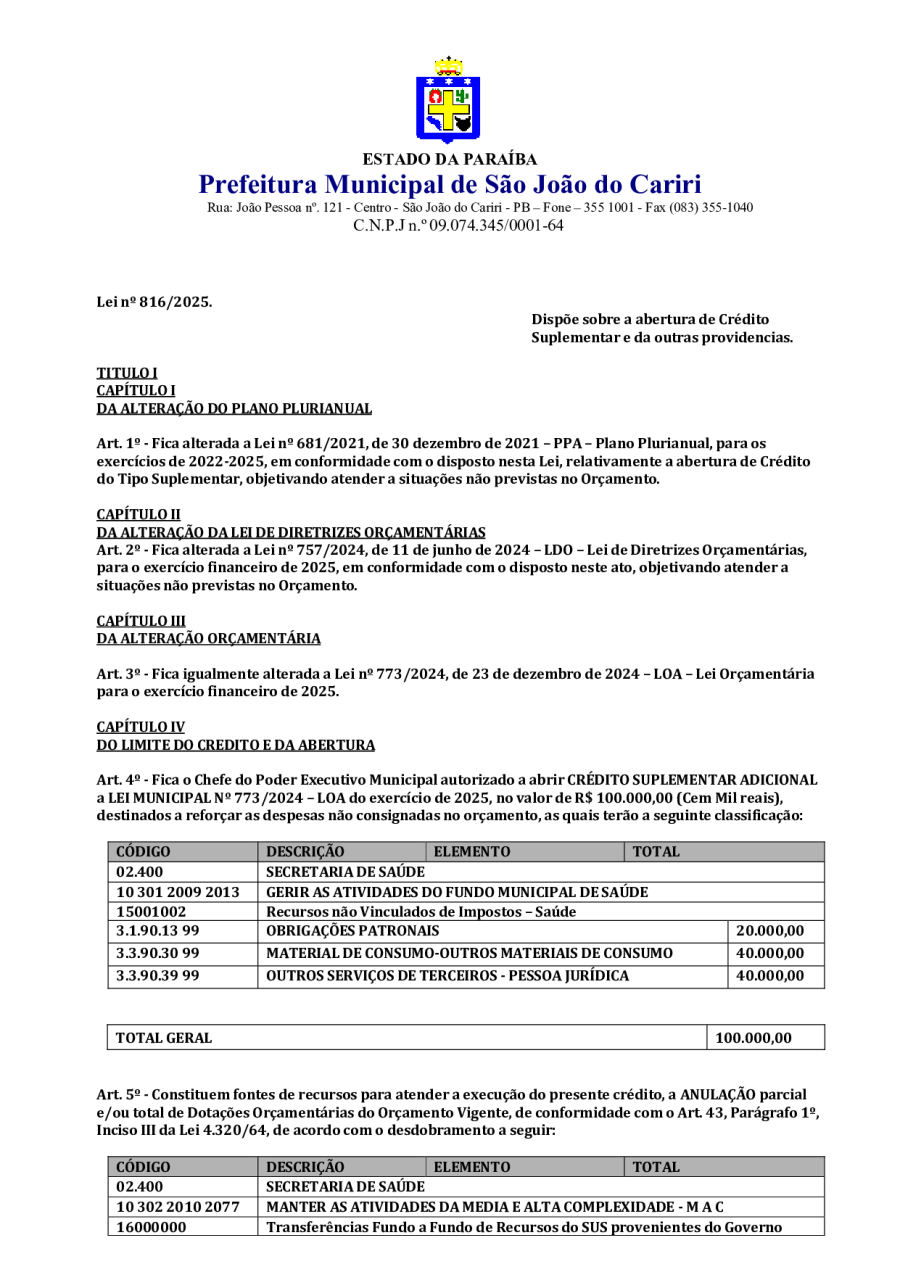LEI 816/2025 - DISPÕE SOBRE A ABERTURA DE CRÉDITO SUPLEMENTAR E DA OUTRAS PROVIDENCIAS