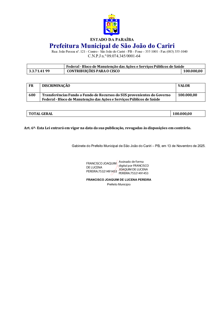 Conforme MP n° 2.200-2 de 24/08/2001, que institui a infraestrutura de chaves Públicas. Matéria Publicada no Diário Oficial do Município de São João do Cariri/PB no dia - Edição 01885.