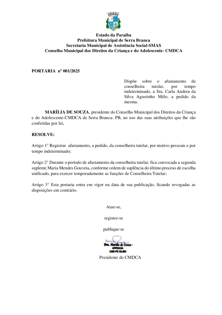 PORTARIA N° 0001/2025 - DISPÕE SOBRE O AFASTAMENTO DE CONSELHEIRA TUTELAR