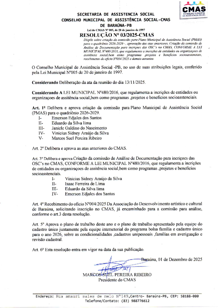 RESOLUÇÃO Nº 03/2025-CMAS - DISPÕE SOBRE CRIAÇÃO DA COMISSÃO PARA O PLANO MUNICIPLA DE ASSISTÊNCIA SOCIAL (PMAS) PARA O QUADRIENIO 2026-2029, APROVAÇÃO DAS ATAS ANTERIORES, CRIAÇÃO DA COMISSÃO DE ANALISE DE DOCUMENTAÇÃO PARA INSCRIÇÕES DAS OSC´S NO CMAS CONFORME A LEI MUNICIPAL Nº 480/2016, QUE REGULAMENTA A INSCRIÇÕES DE ENTIDADES OU ORGANIZAÇÕES DE ASSISTENCIA SOCIAL, BEM COMO PROGRAMAS, PROJETOS E BENEFICIOS SOCIOASSISTENCIAIS, RECEBIMENTO DO OFICIO Nº 004/2025 E DEMAIS ASSUNTOS. - 01 DE DEZEMBRO DE 2025.