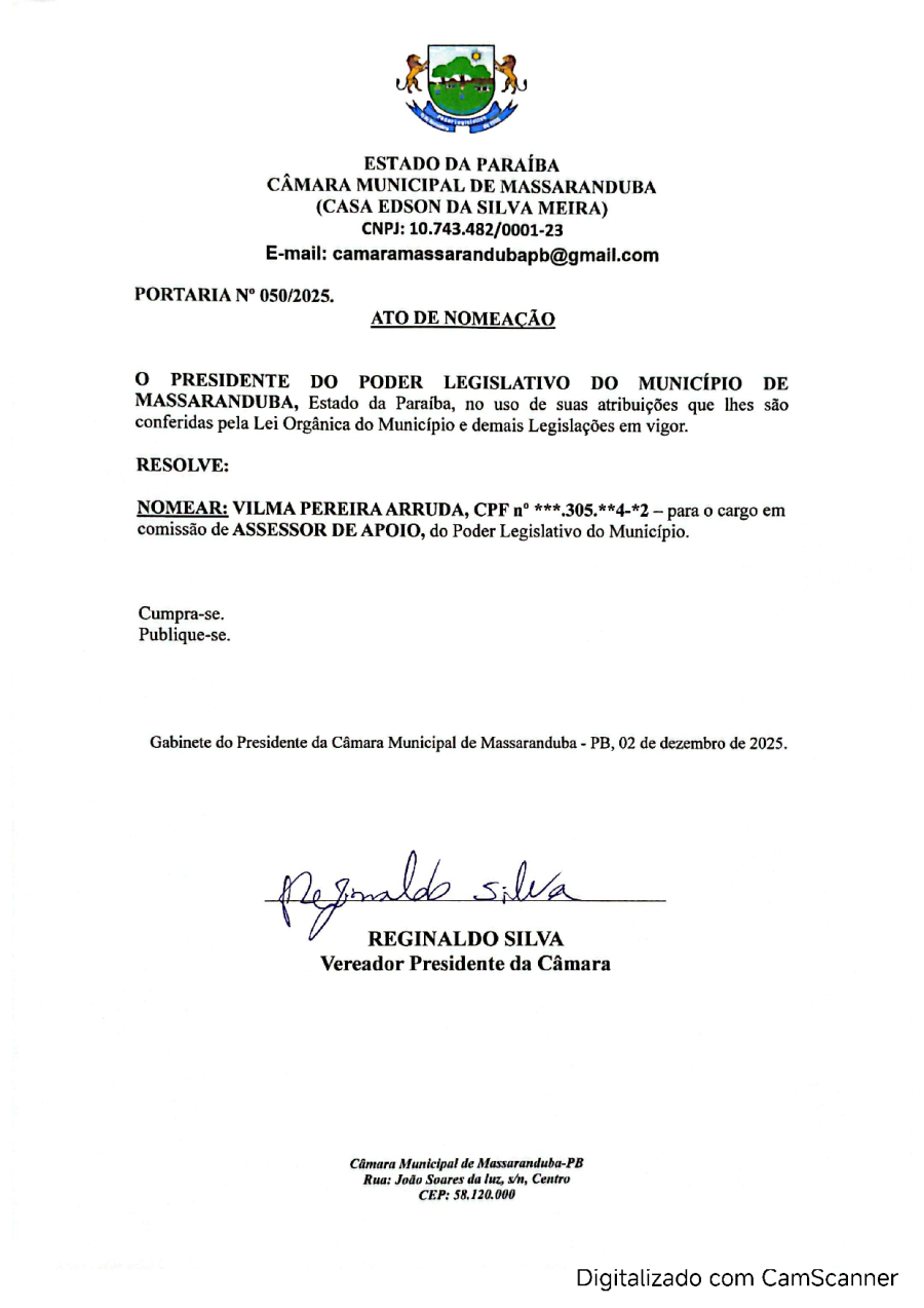 PORTARIA N° 0050/2025 - NOMEAÇÃO DE VOLMA PERREIRA ARRUDA