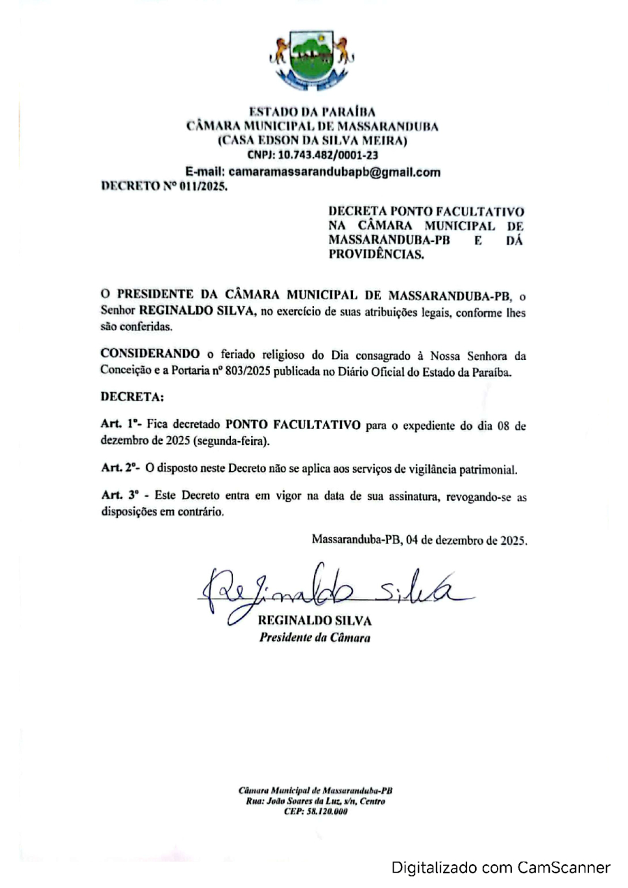 DECRETO N° 0011/2025 - DECRETA PONTO FACULTATIVO NA CÂMARA MUNICIPAL