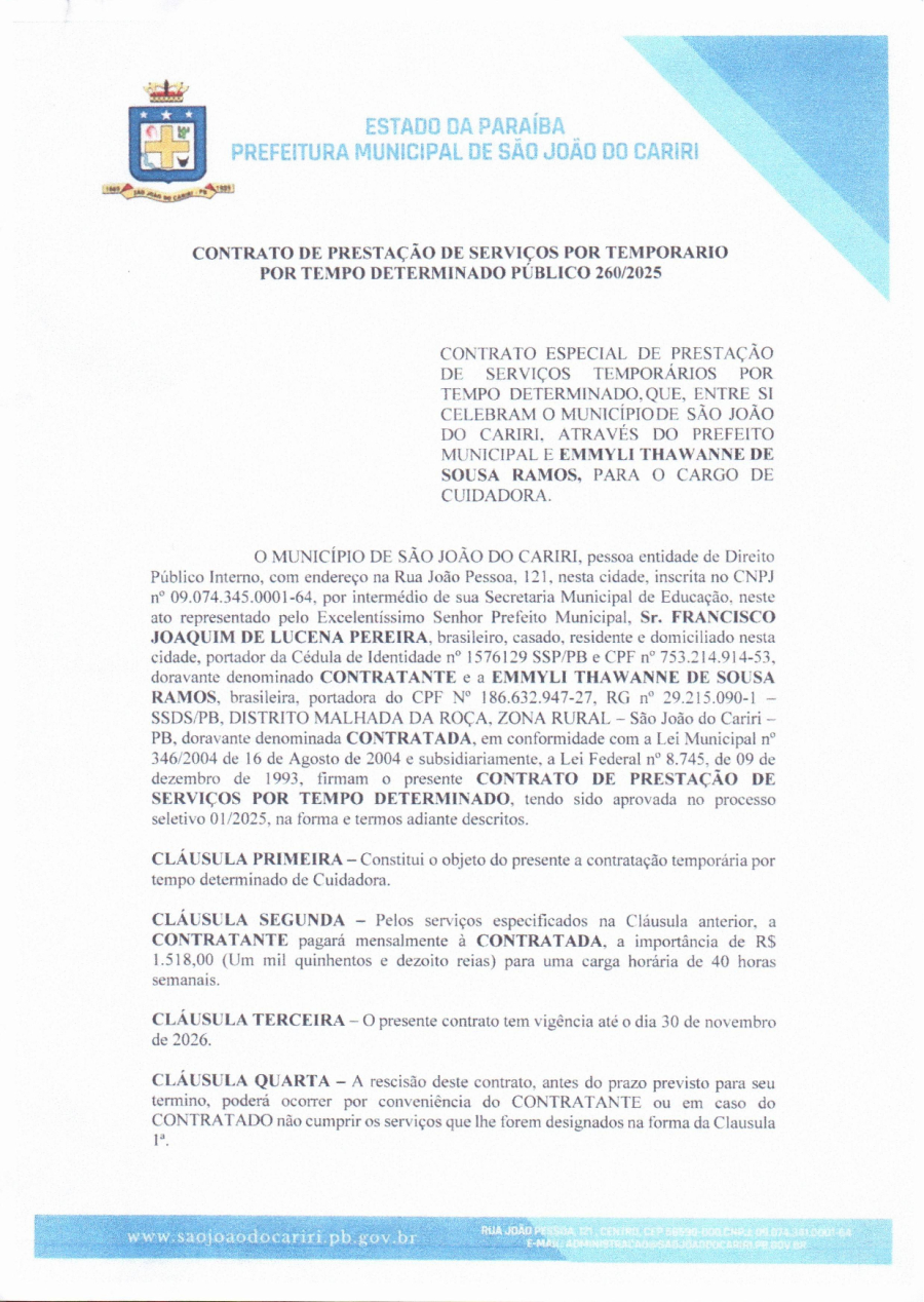 Conforme MP n° 2.200-2 de 24/08/2001, que institui a infraestrutura de chaves Públicas. Matéria Publicada no Diário Oficial do Município de São João do Cariri/PB no dia - Edição 01873.