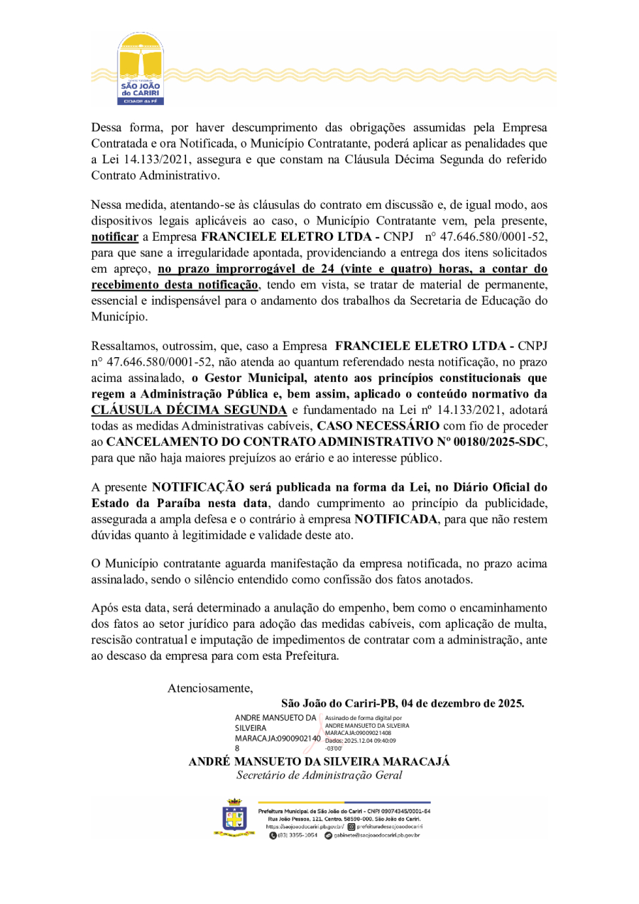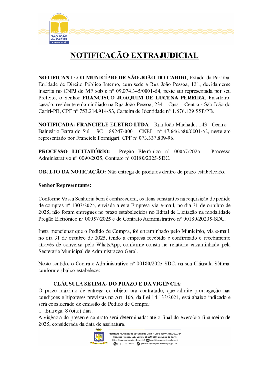 NOTIFICAÇÃO EXTRAJUDICIAL - FRANCIELE ELETRO LTDA - PREGÃO ELETRÔNICO N° 00057/2025 – PROCESSO ADMINISTRATIVO N° 0090/2025, CONTRATO Nº 00180/2025-SDC.