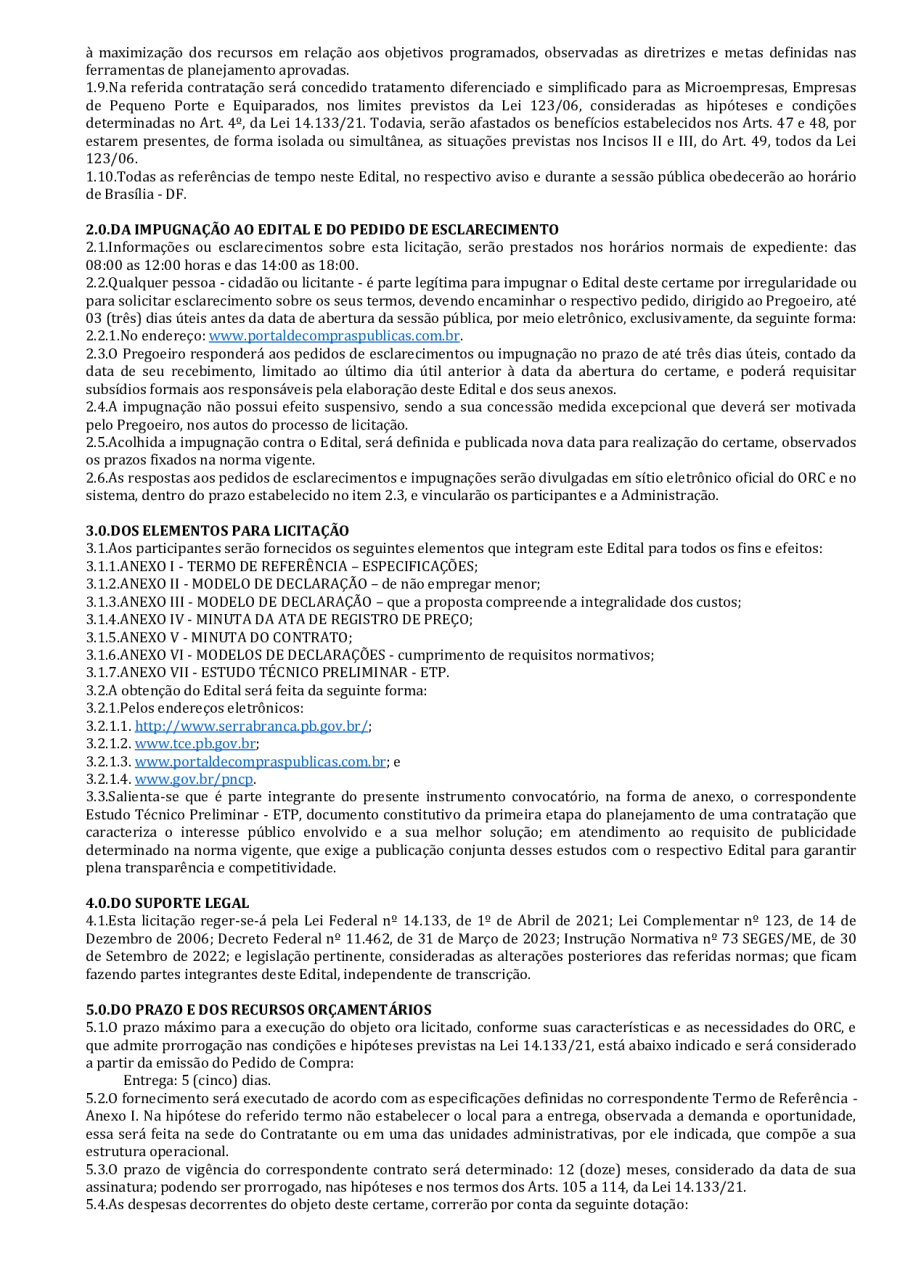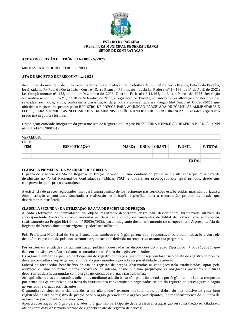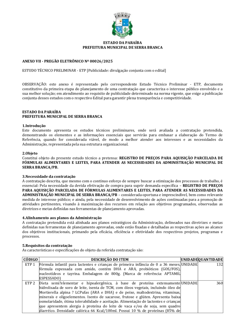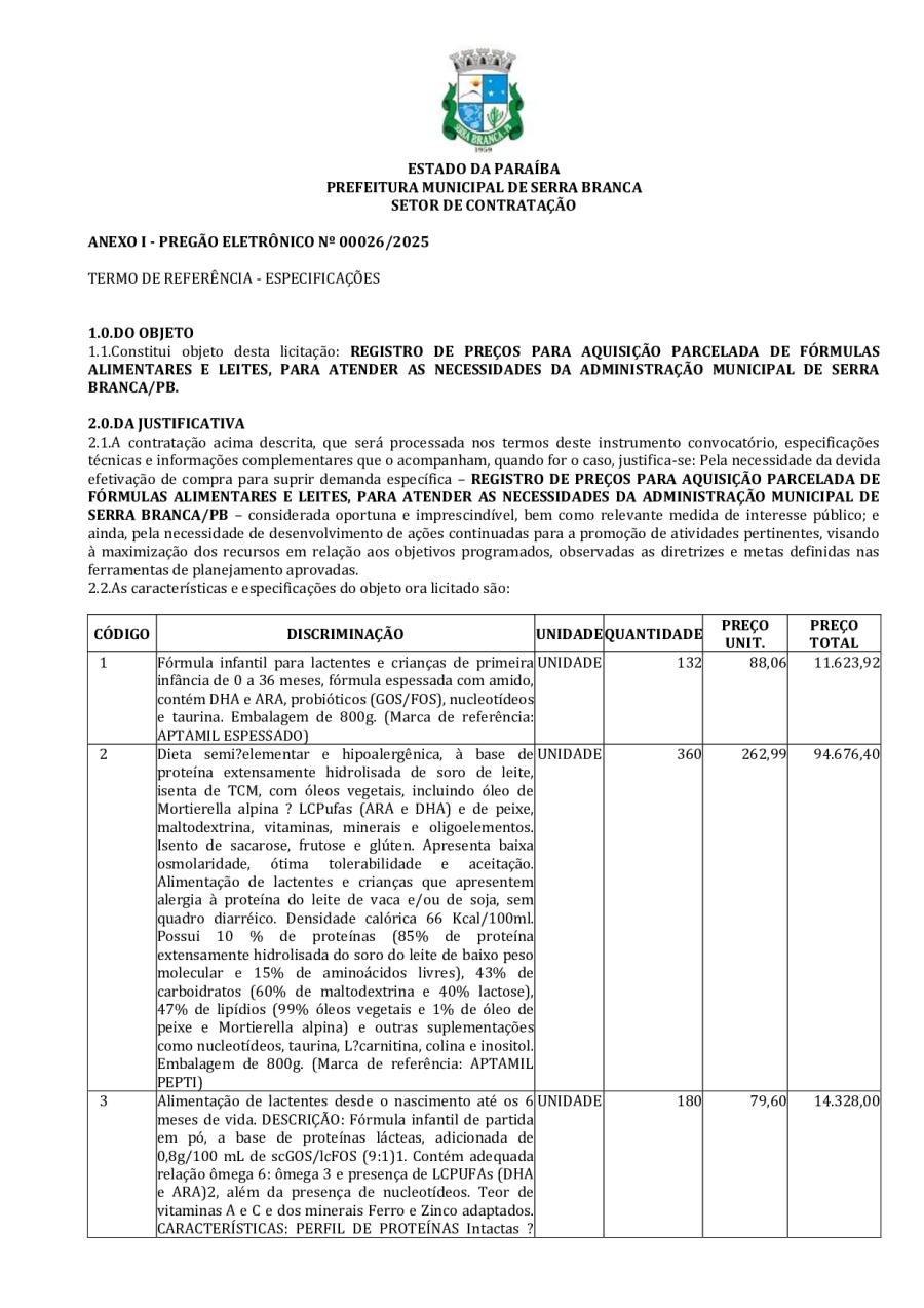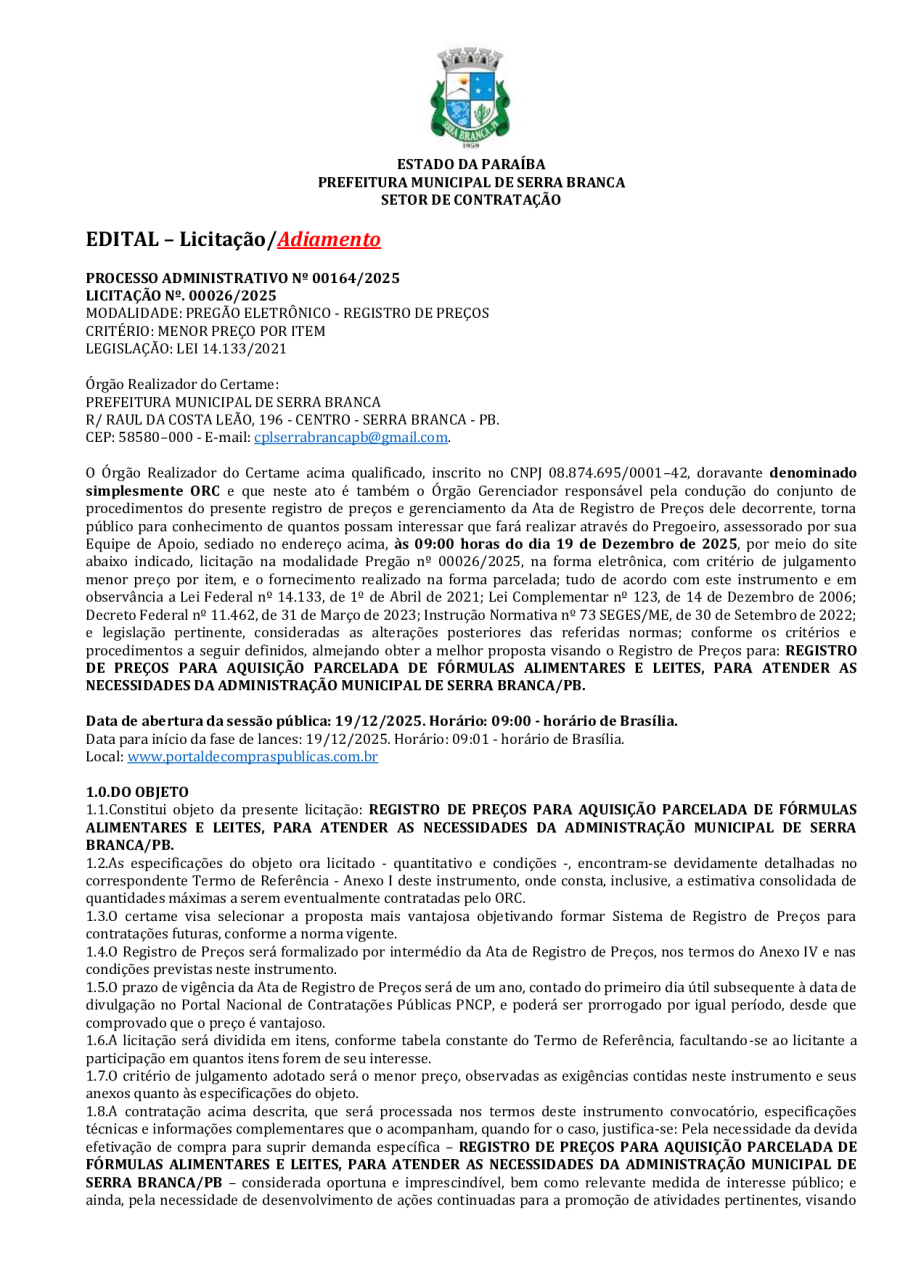 EDITAL PREGÃO ELETRÔNICO 00026/2025 - REGISTRO DE PREÇOS PARA AQUISIÇÃO PARCELADA DE FÓRMULAS ALIMENTARES E LEITES, PARA ATENDER AS NECESSIDADES DA ADMINISTRAÇÃO MUNICIPAL DE SERRA BRANCA/PB.