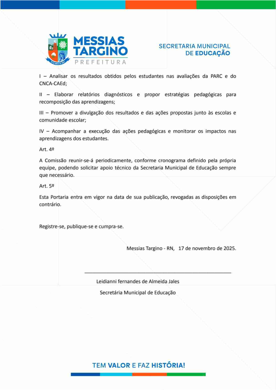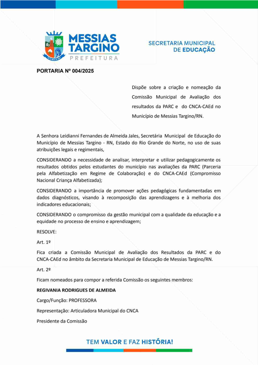 PORTARIA Nº 04/2025 - CRIAÇÃO E NOMEAÇÃO DA COMISSÃO MUNICIPAL DE AVALIAÇÃO DOS RESULTADOS DA PARC E DO CNCA-CAED NO MUNICÍPIO DE MESSIAS TARGINO/RN
