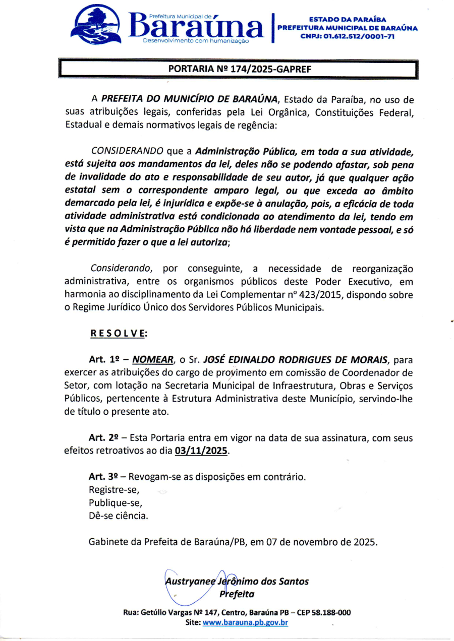 PORTARIA Nº 174/2025-GAPREF - NOMEAR O SR. JOSE EDINALDO RODRIGUES DE MORAIS, PARA EXERCER AS ATRIBUIÇÕES DO CARGO DE PROVIMENTO EM COMISSÃO DE COORDENADOR DE SETOR. - 05 DE DEZEMBRO DE 2025.