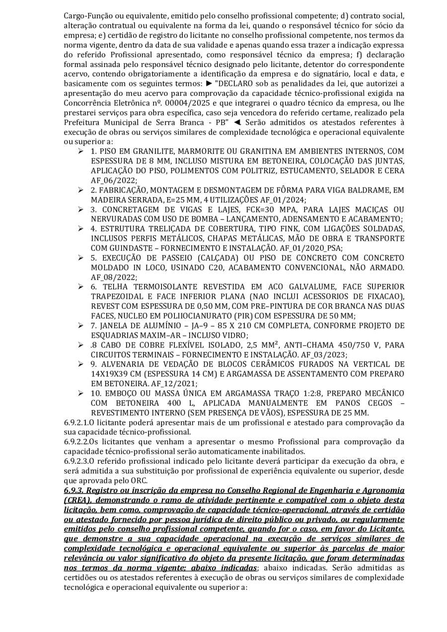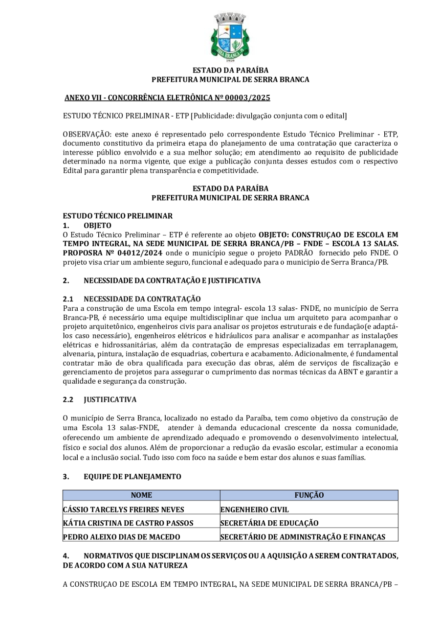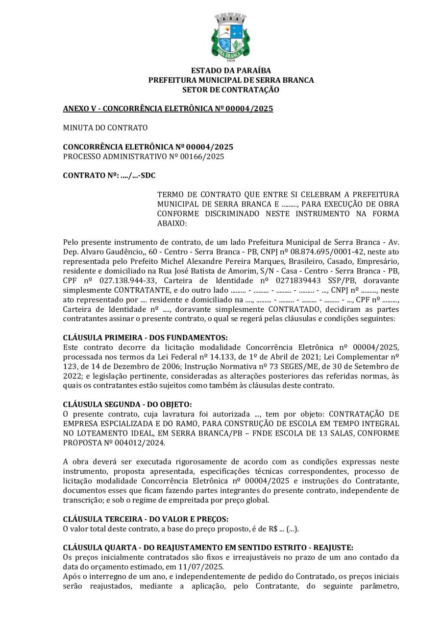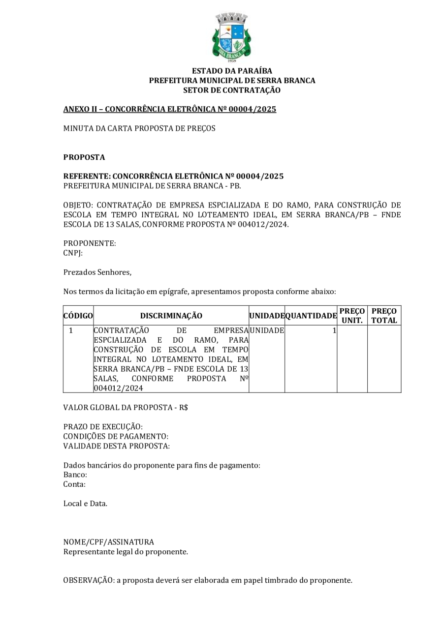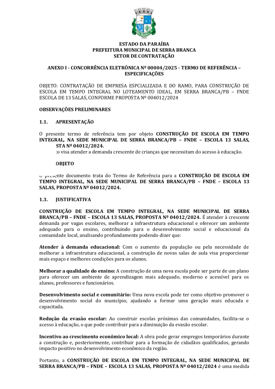 CONCORRÊNCIA ELETRÔNICA Nº 00004/2025 - CONTRATAÇÃO DE EMPRESA ESPCIALIZADA E DO RAMO, PARA CONSTRUÇÃO DE ESCOLA EM TEMPO INTEGRAL NO LOTEAMENTO IDEAL, EM SERRA BRANCA/PB – FNDE ESCOLA DE 13 SALAS, CONFORME PROPOSTA Nº 004012/2024.
