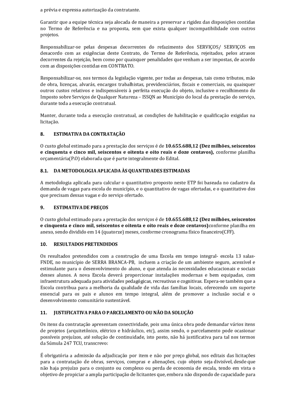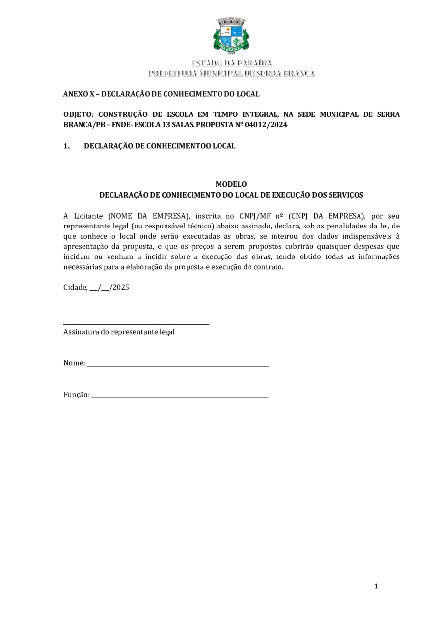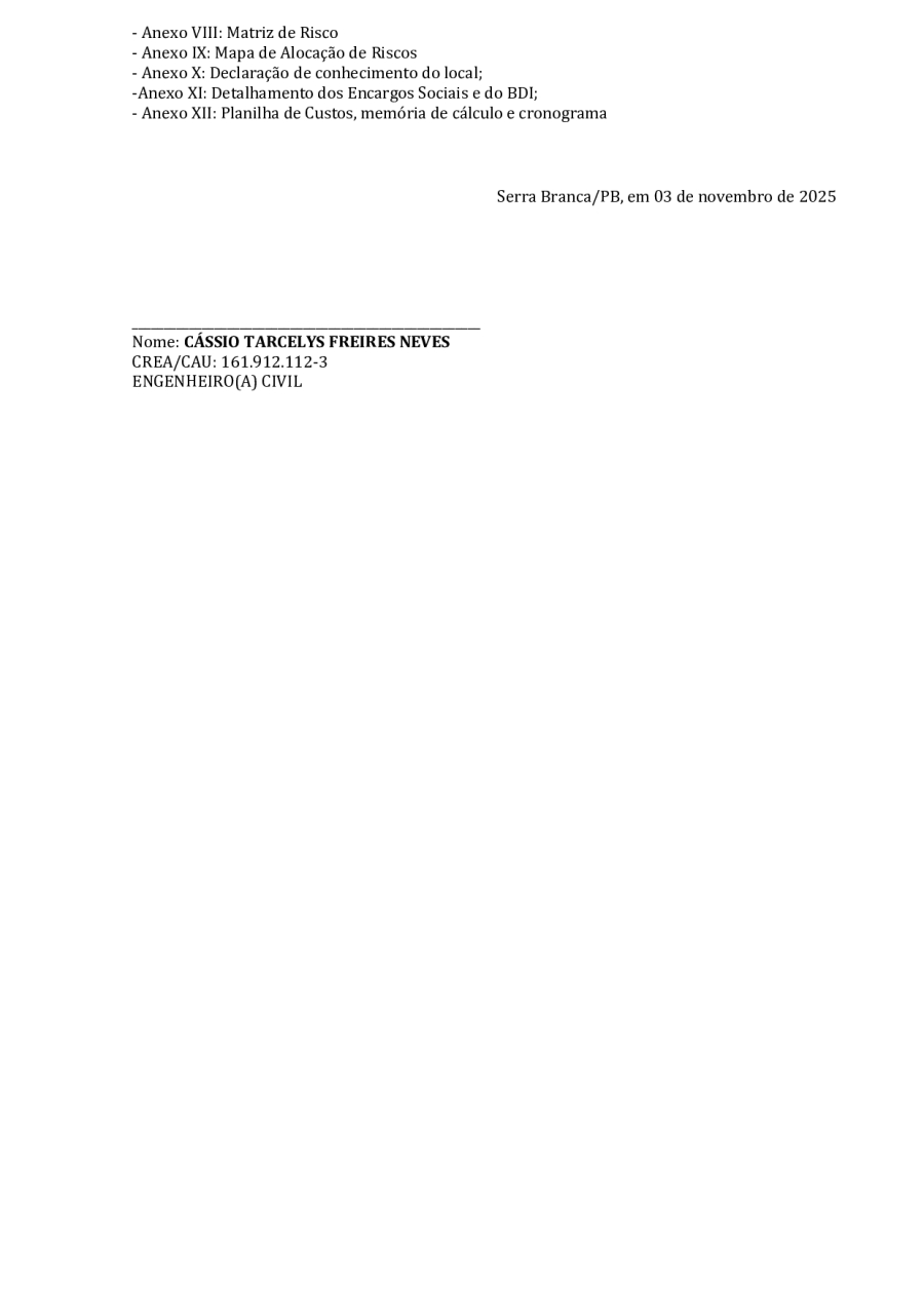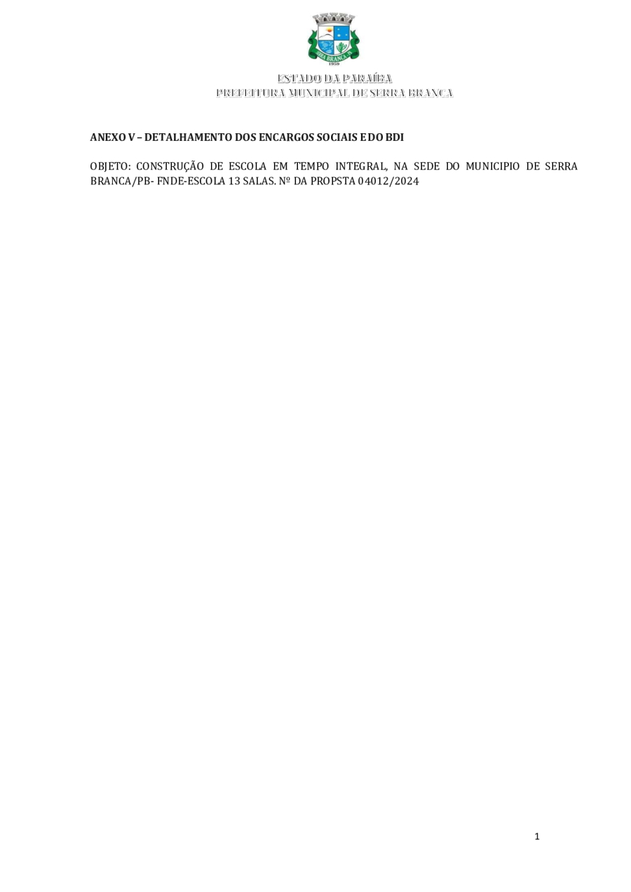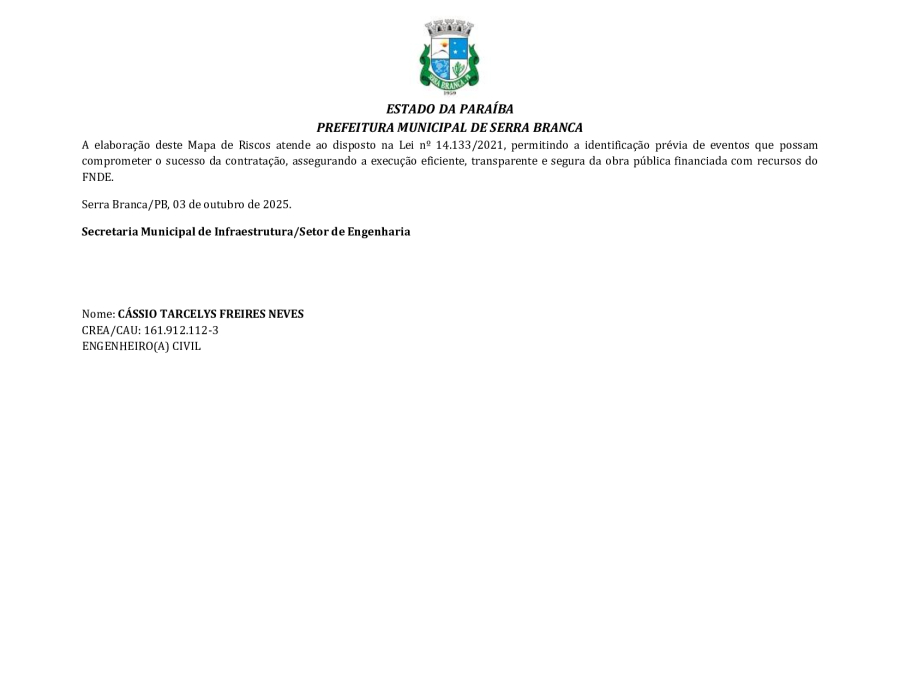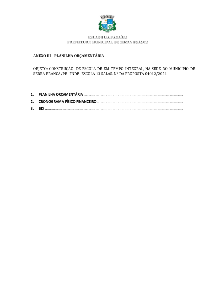 CONCORRÊNCIA ELETRÔNICA Nº 00004/2025 - CONTRATAÇÃO DE EMPRESA ESPCIALIZADA E DO RAMO, PARA CONSTRUÇÃO DE ESCOLA EM TEMPO INTEGRAL NO LOTEAMENTO IDEAL, EM SERRA BRANCA/PB – FNDE ESCOLA DE 13 SALAS, CONFORME PROPOSTA Nº 004012/2024.
