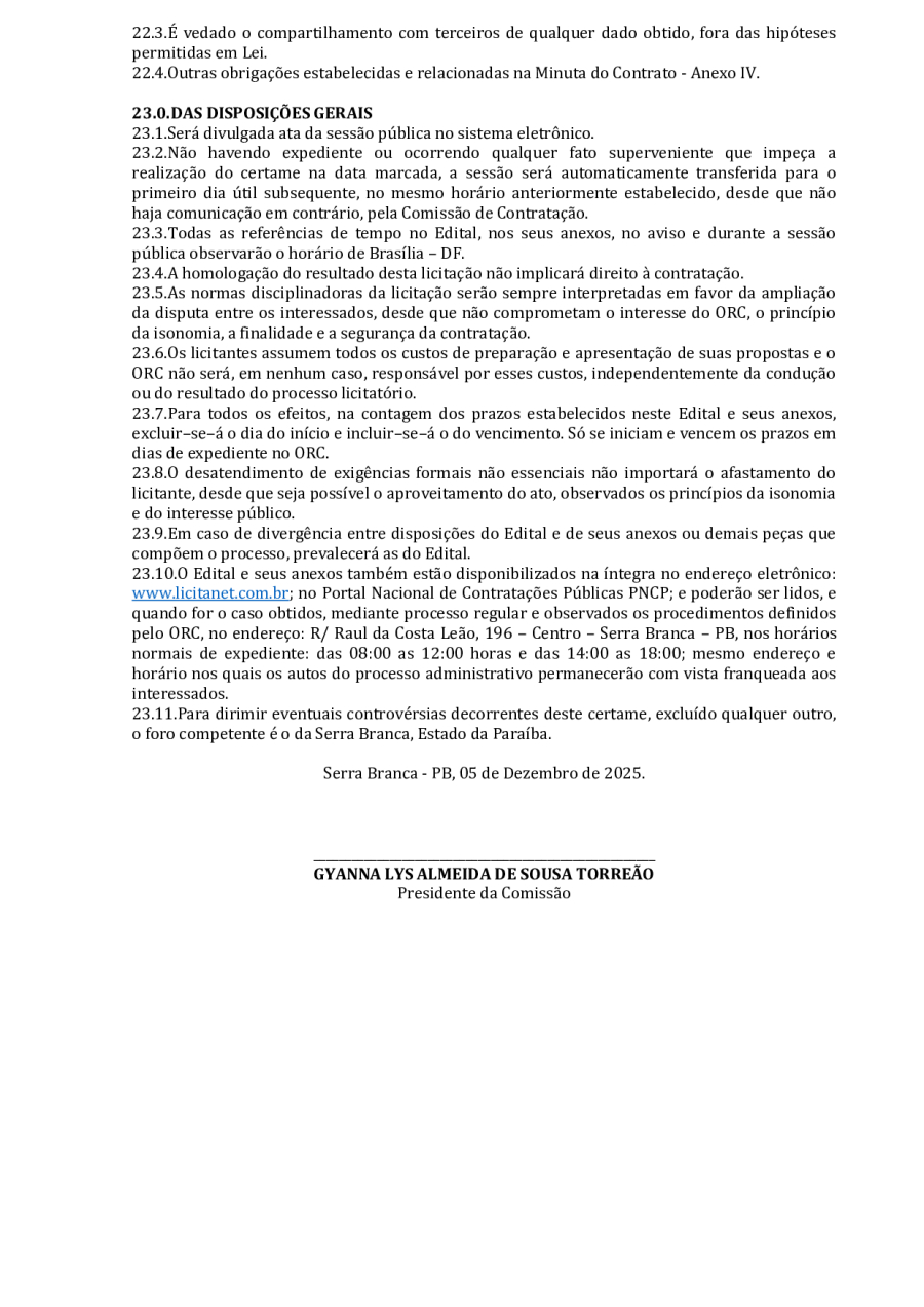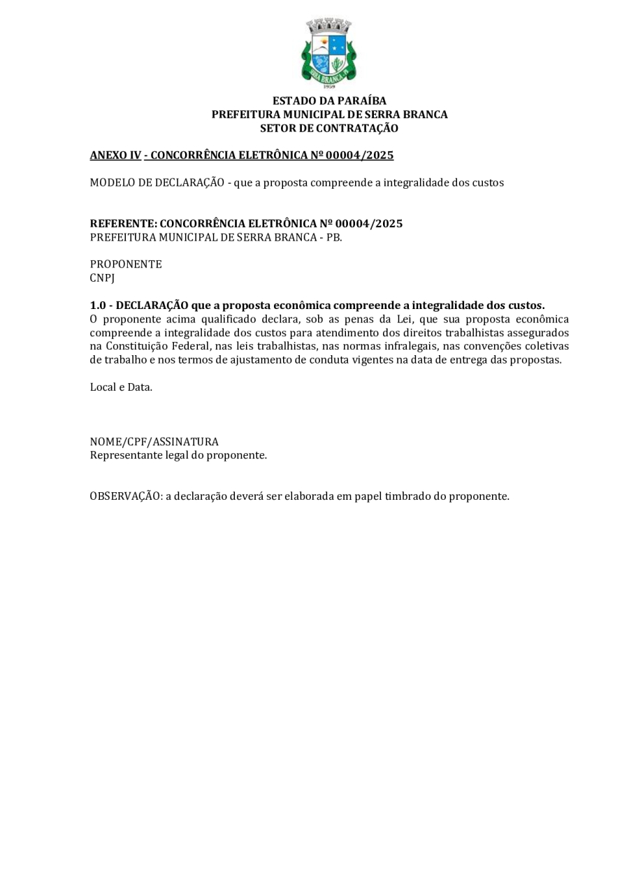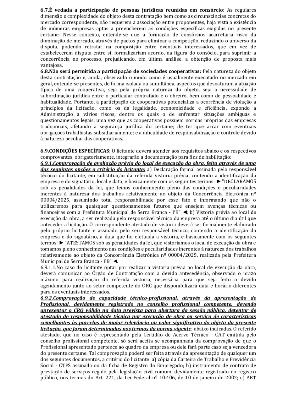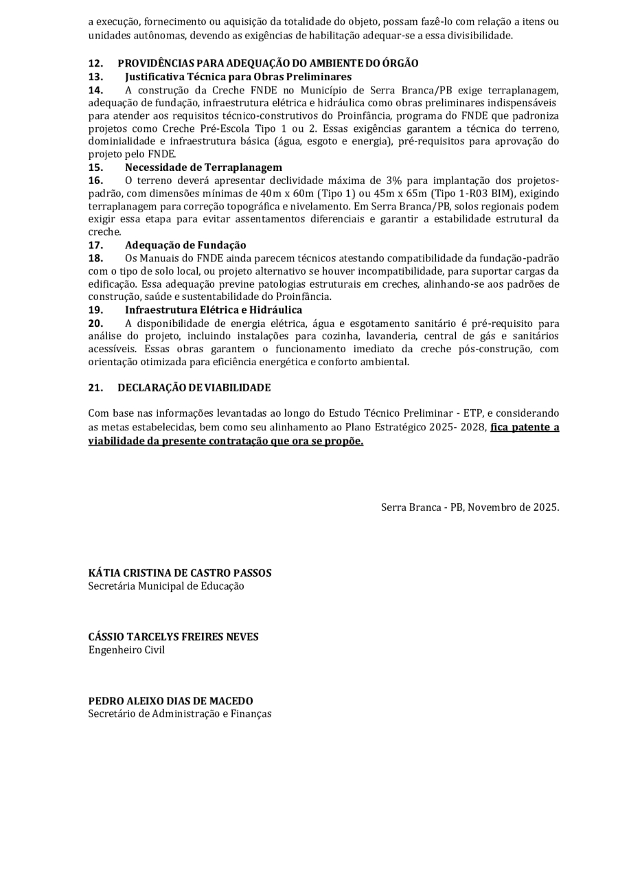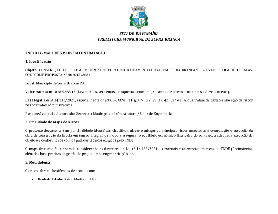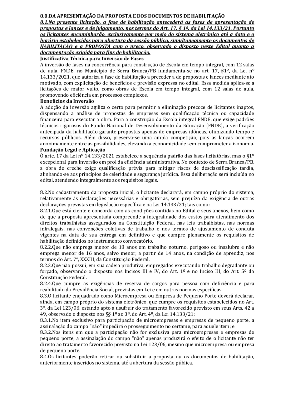 CONCORRÊNCIA ELETRÔNICA Nº 00004/2025 - CONTRATAÇÃO DE EMPRESA ESPCIALIZADA E DO RAMO, PARA CONSTRUÇÃO DE ESCOLA EM TEMPO INTEGRAL NO LOTEAMENTO IDEAL, EM SERRA BRANCA/PB – FNDE ESCOLA DE 13 SALAS, CONFORME PROPOSTA Nº 004012/2024.