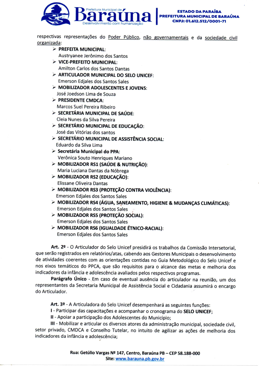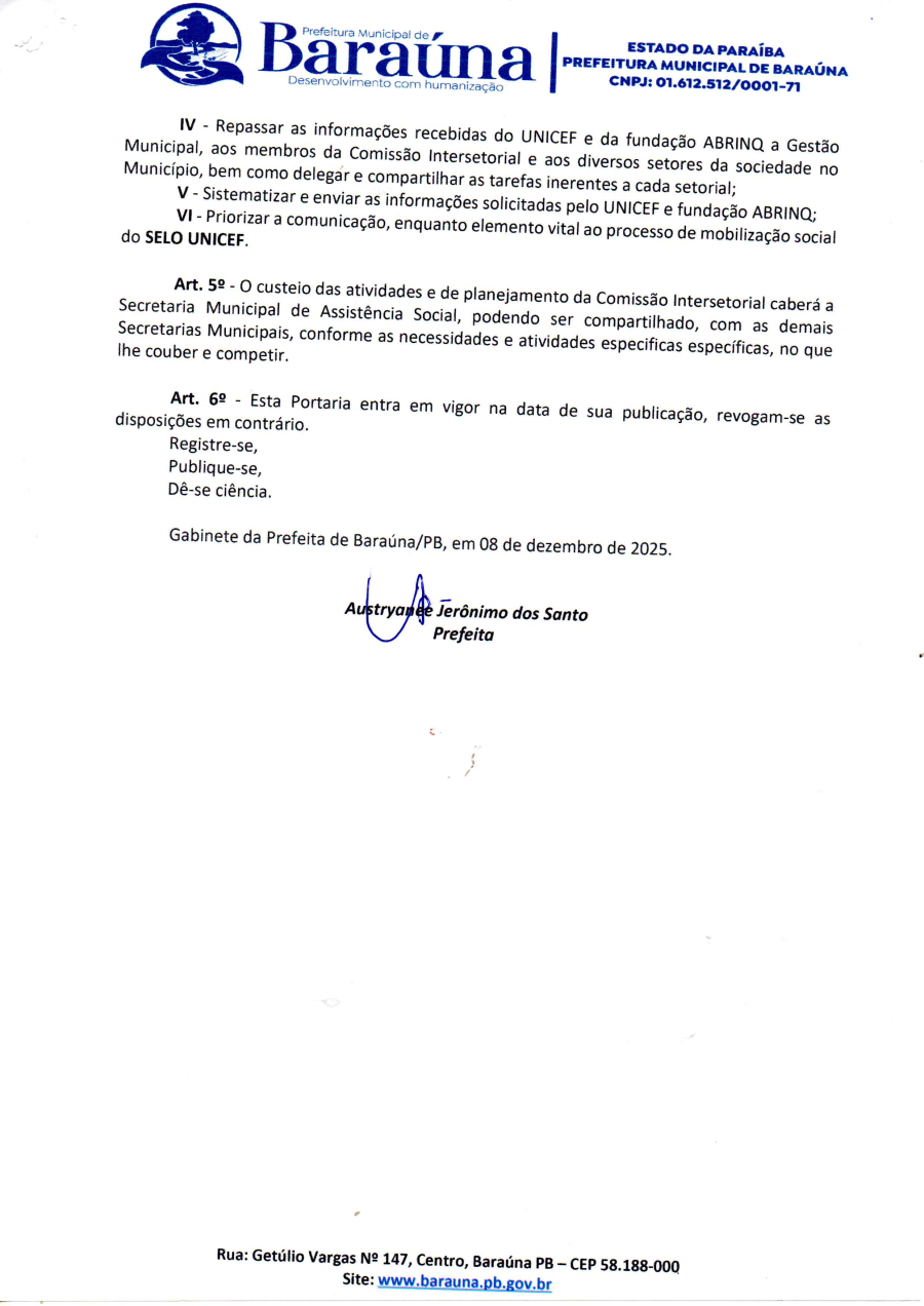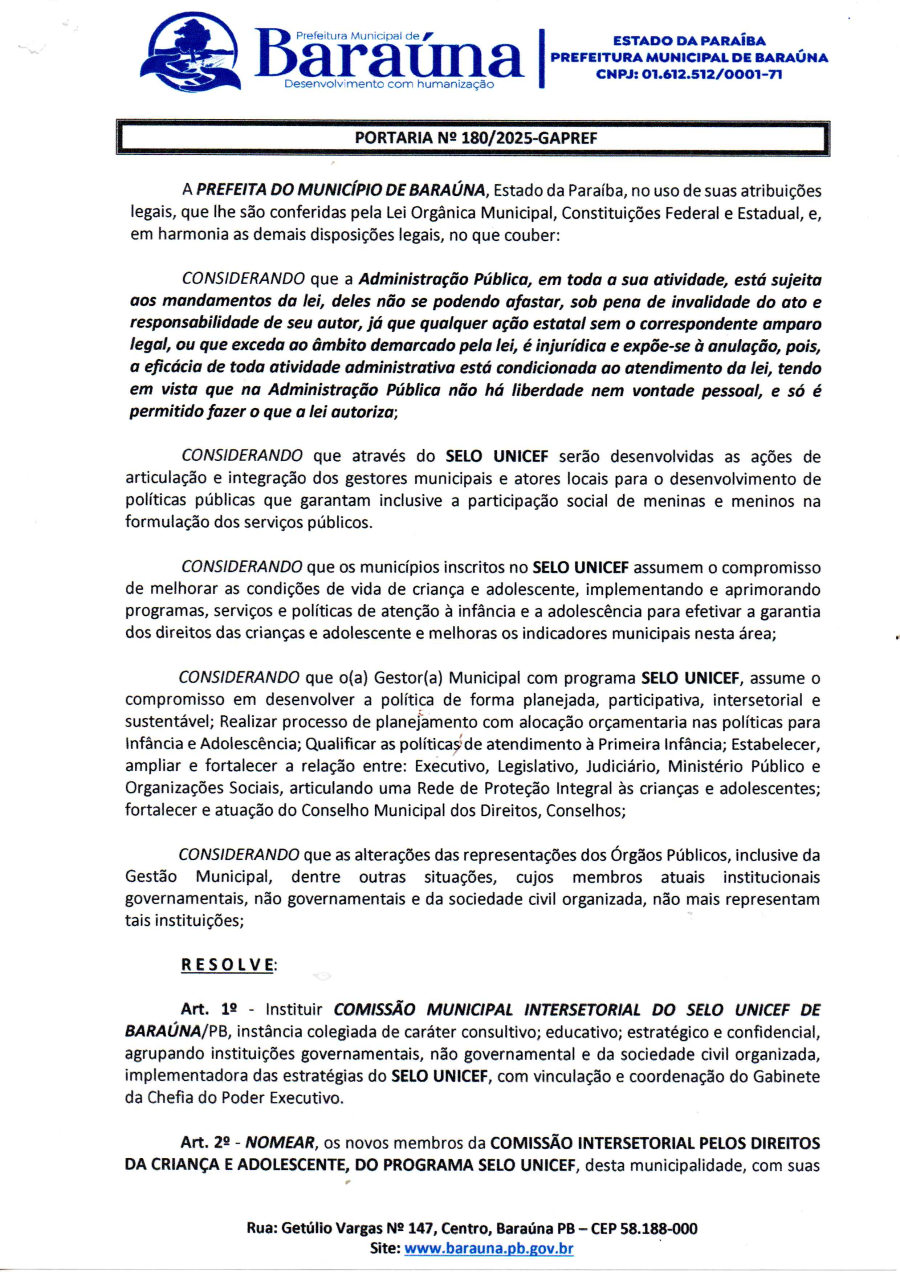 RETIFICAÇÃO - PORTARIA Nº 180/2025-GAPREF - INSTITUIR COMISSÃO MUNICIPAL INTERSETORIAL DO SELO UNICEF DE BARAÚNA/PB; E NOMEAR OS NOVOS MEMBROS DA COMISSÃO INTERSETORIAL PELOS DIREITOS DA CRIANÇA E DO ADOLESCENTE, DO PROGRAMA SELO UNICEF. - 10 DE DEZEMBRO DE 2025.