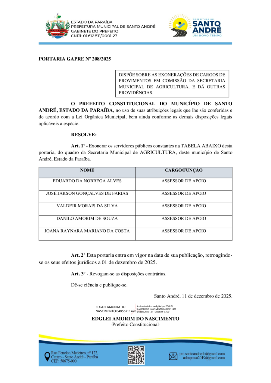 PORTARIA GAPRE Nº 208/2025 - DISPÕE SOBRE AS EXONERAÇÕES DE CARGOS DE PROVIMENTOS EM COMISSÃO DA SECRETARIA MUNICIPAL DE AGRICULTURA, E DÁ OUTRAS PROVIDÊNCIAS